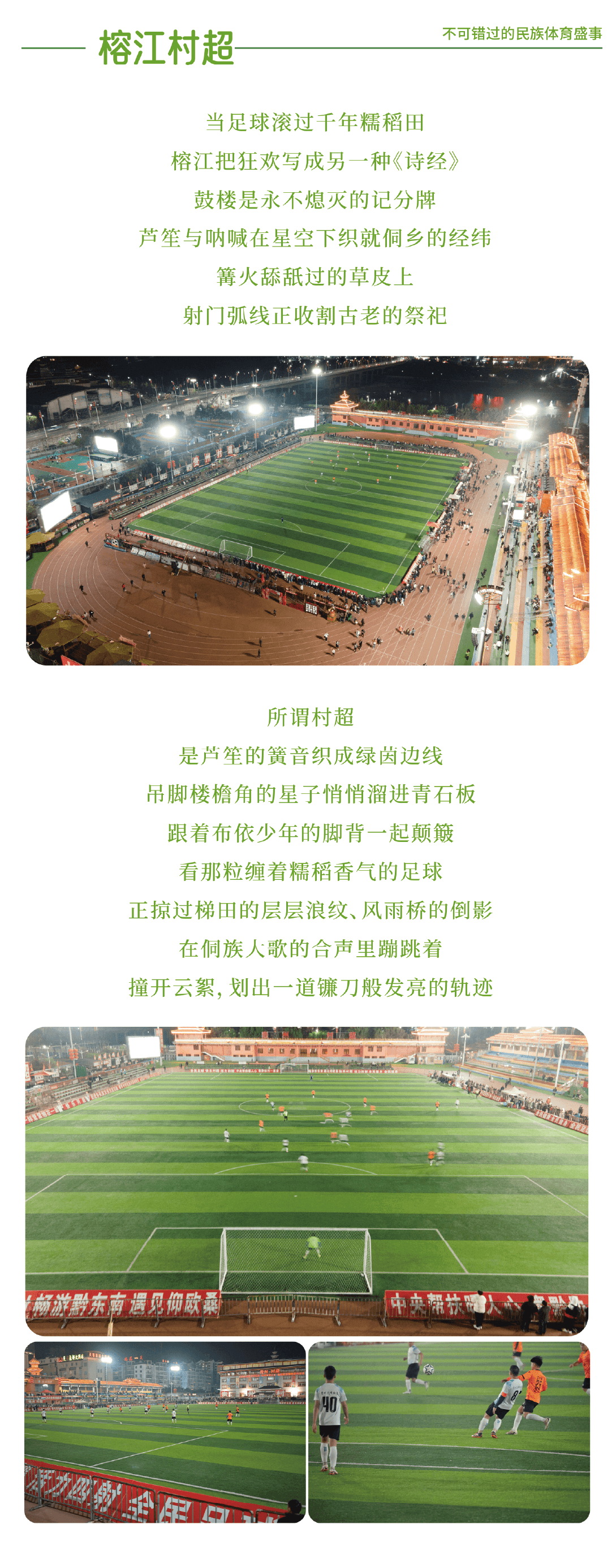 下午前往榕江县城入住酒店,晚上前往村超现场感受这黔东南少数民族的体育盛事,感受侗族人的热情。注:村超因赛事的原因,并不是每天都有村超赛事,具每次村超的参与人数和气氛各不相同,请在报名时咨询客服准确的赛事表,如因不可搞力因素或赛事安排未能观看村超,我社不作任何经济补偿。