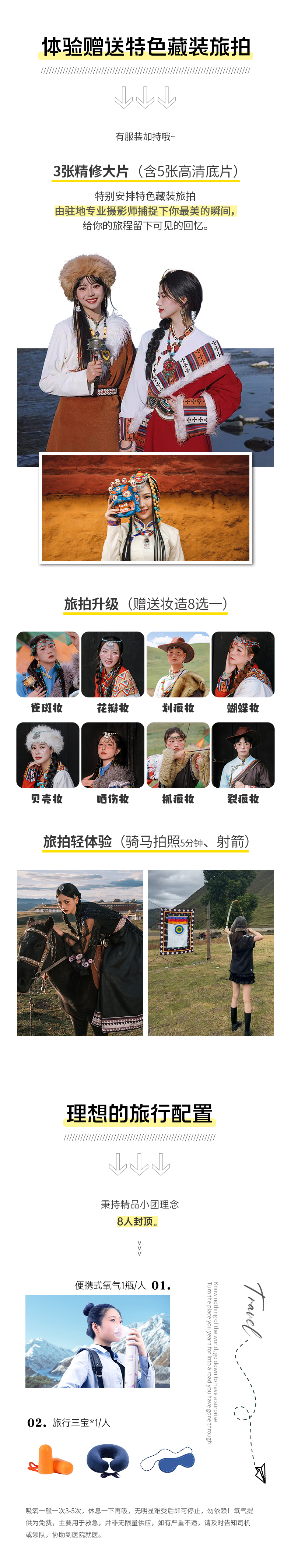 包含体验特色藏装旅拍(3张精修照片含5张高清底片),妆造8选1(升级骑马旅拍体验5分钟,射箭体验)