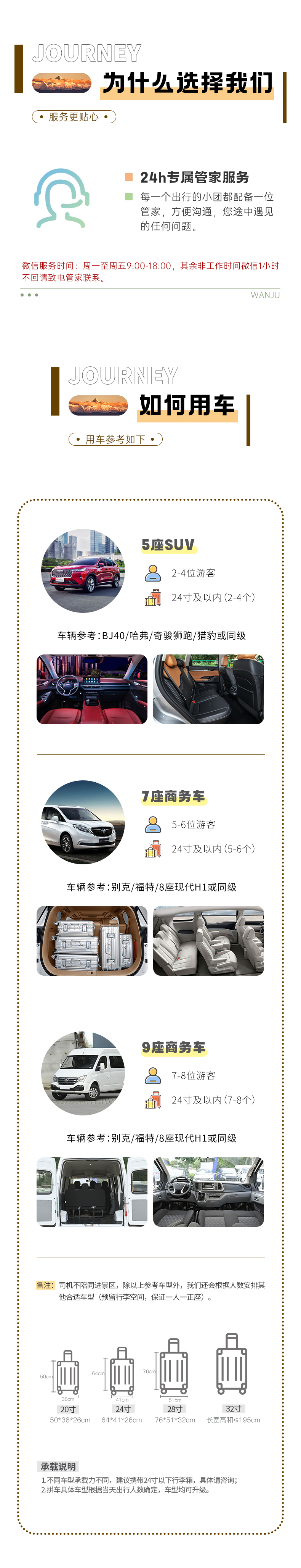 备注:车型承载力有限,携带行李为24寸或以下行李箱。