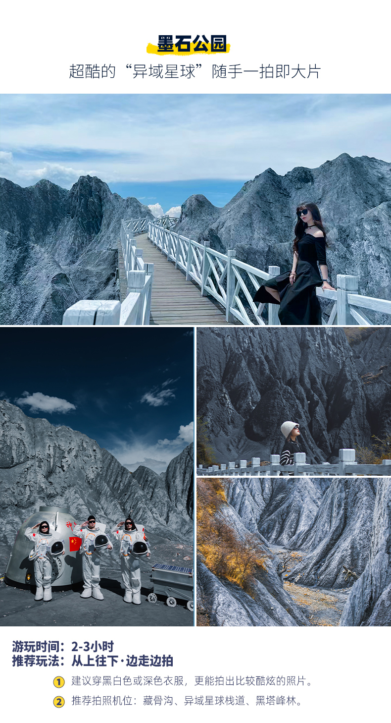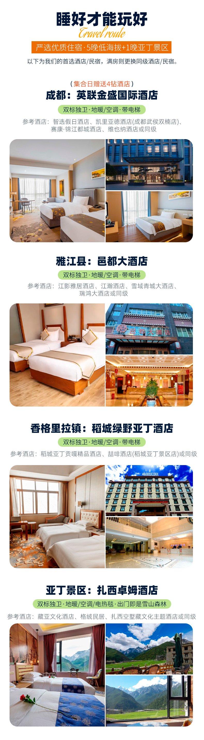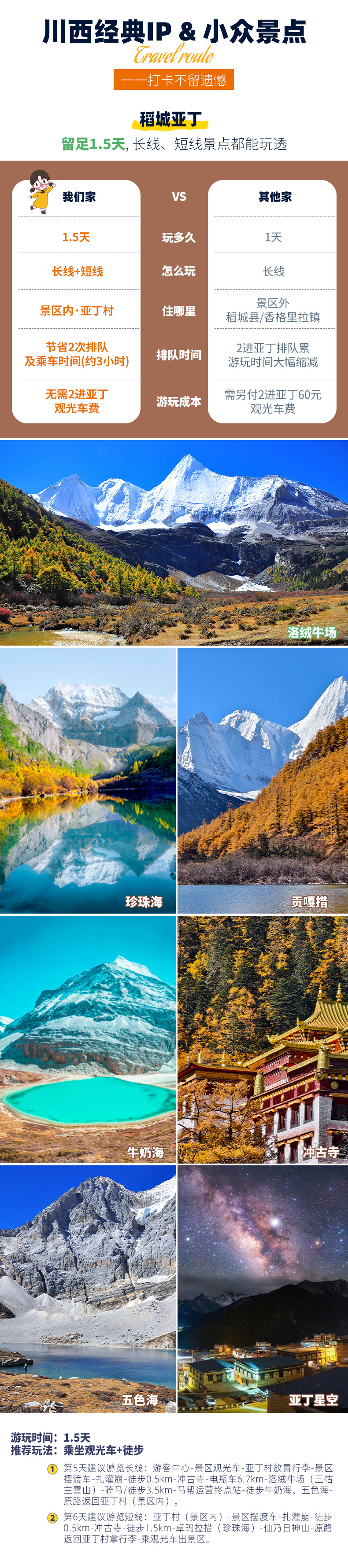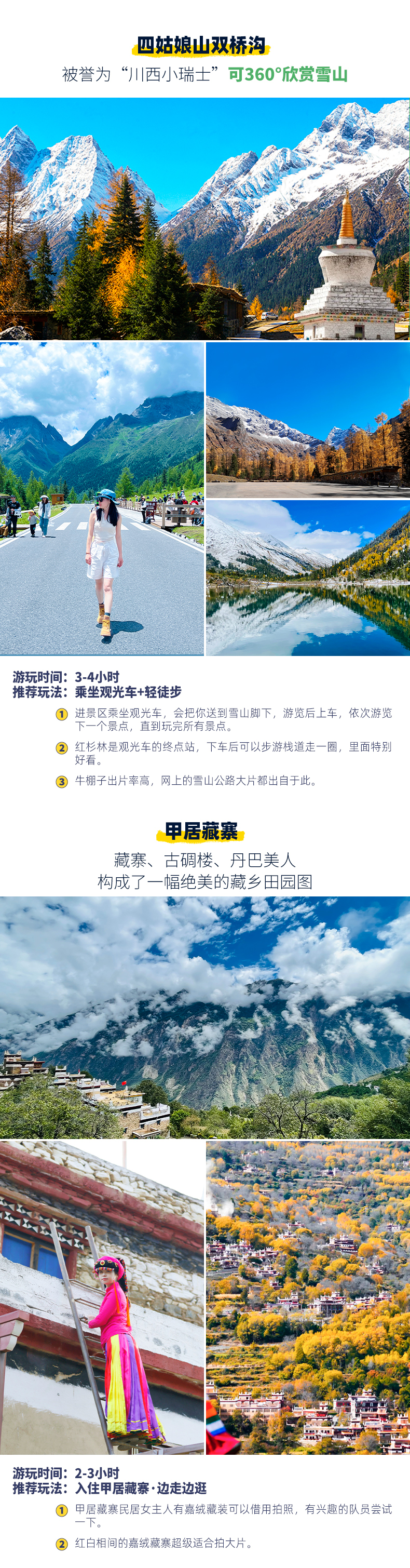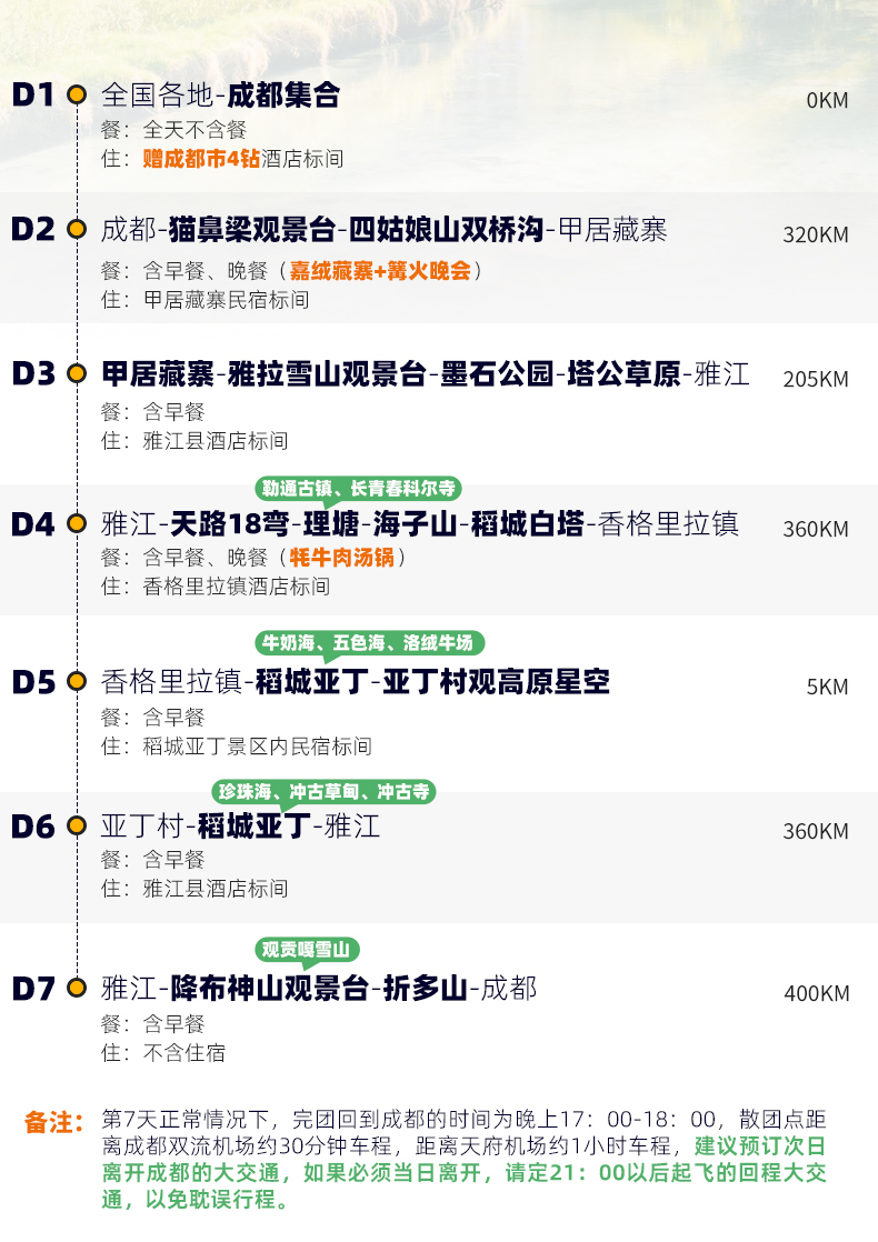 4、景交:四姑娘山观光车70元/人(必须),甲居藏寨观光车35元/人(必须),墨石公园观光车20元/人(必须),稻城亚丁观光车120元/人(必须)、稻城亚丁游览车70元/往返(可选);