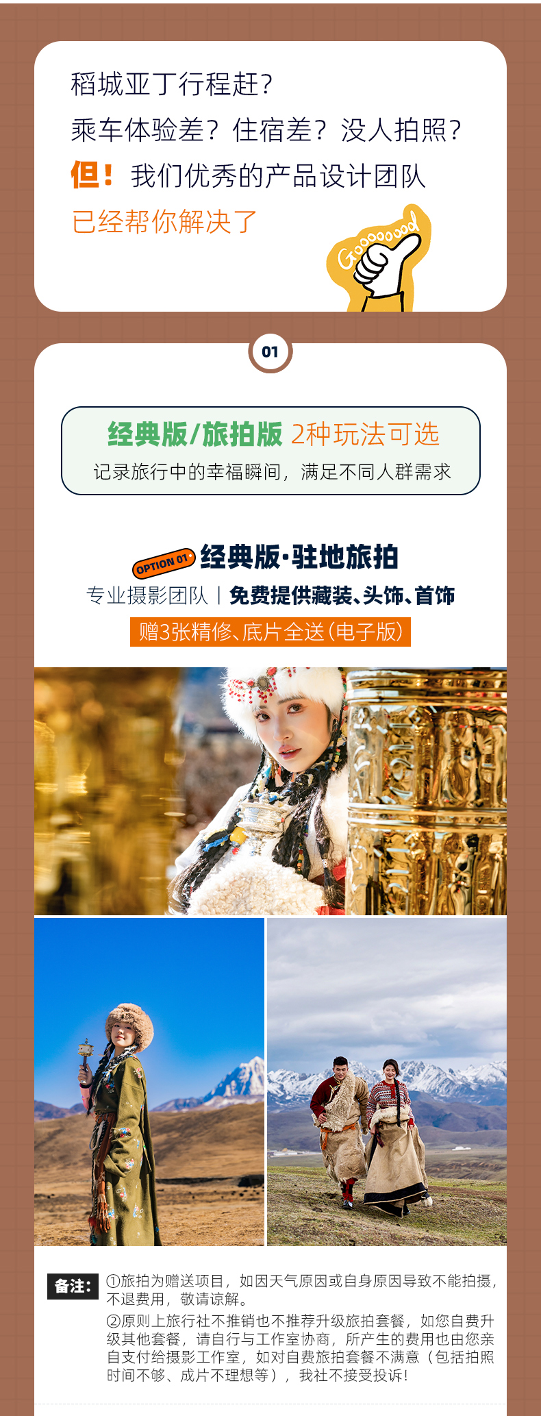 (1)经典版·驻地旅拍:免费提供藏装/首饰/头饰,赠3张电子版简修,底片全送;