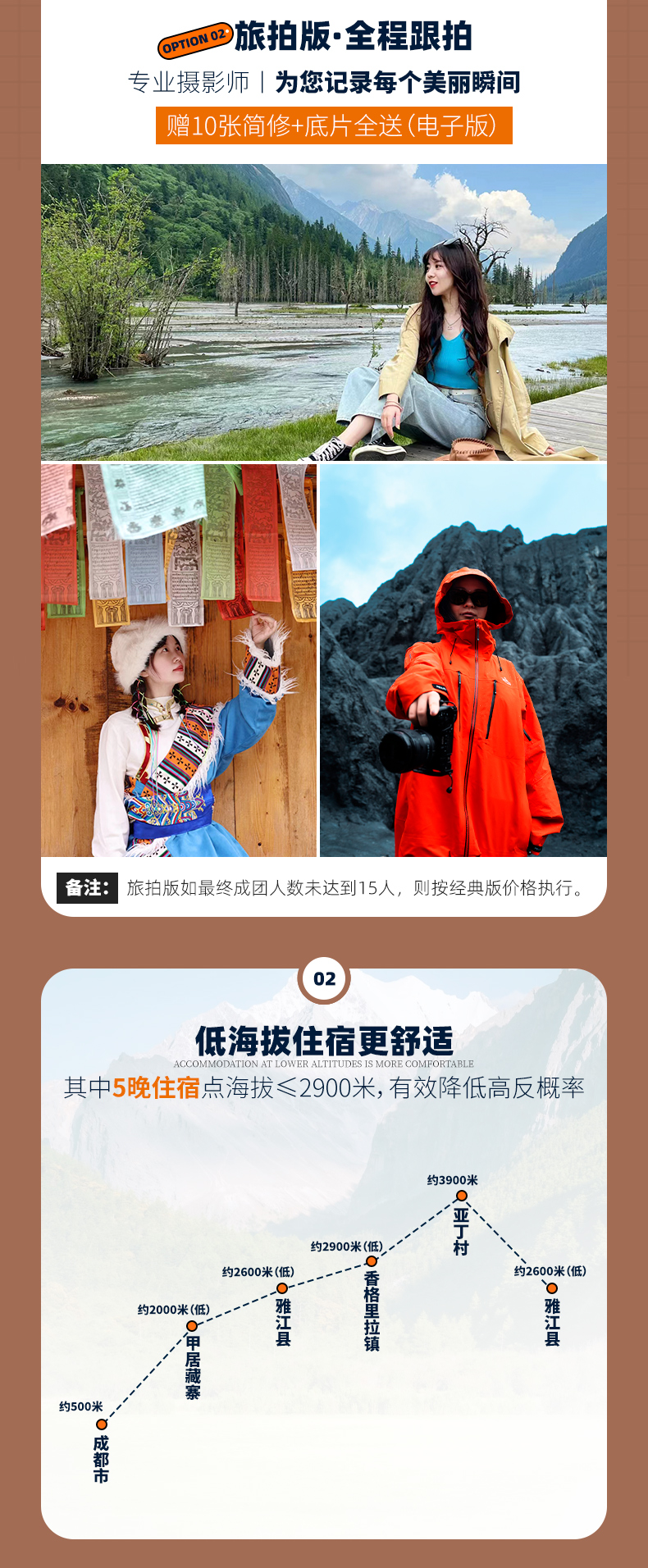 1、团期中标注“【旅拍版 · 全程跟拍】”字样的,是我们产品宣发图拍摄的团期,此类团期15人即升级摄影师+领队双人服务,所拍摄的照片、视频等素材将会用于我们后续的宣发。选择报名这条路线的小伙伴,说不定会成为我们“产品代言人”哦!完团后赠10张简修+底片全送(电子版),如最终成团人数未达到15人,则按常规团价格执行。