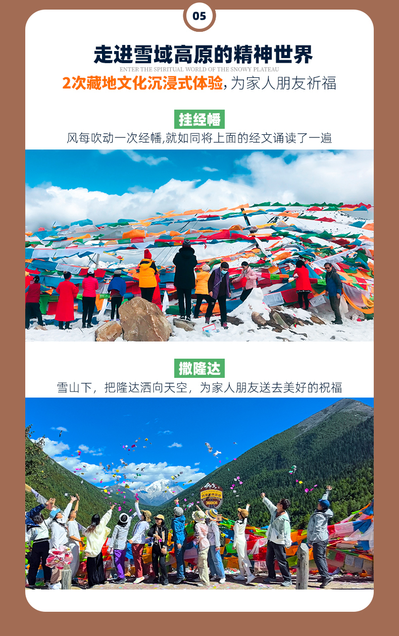 1、藏地人文体验:挂经幡、撒隆达、献哈达、喝酥油茶、围着篝火跳锅庄(8人及以上安排);