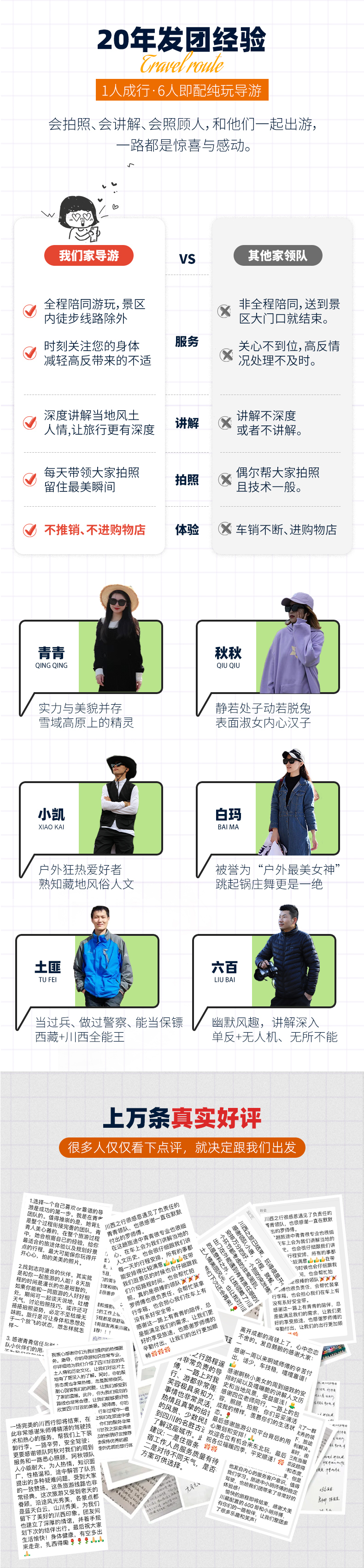 4、领队:优秀纯玩领队服务(1-5人司机兼向导,6人及以上配专职领队,已含领队食宿门票);