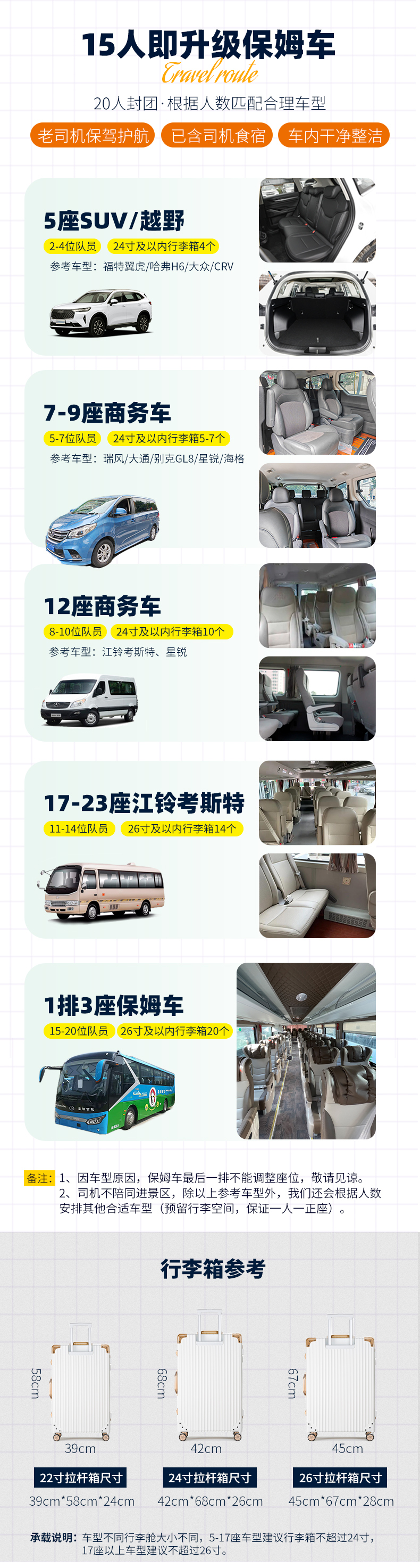 1、交通:根据人数确定车辆,15人即升级保姆车(已含驾驶员食宿);