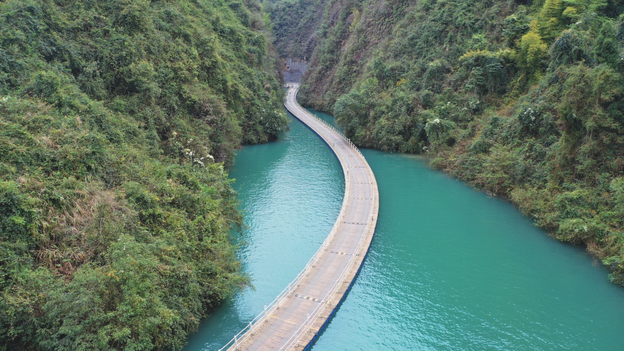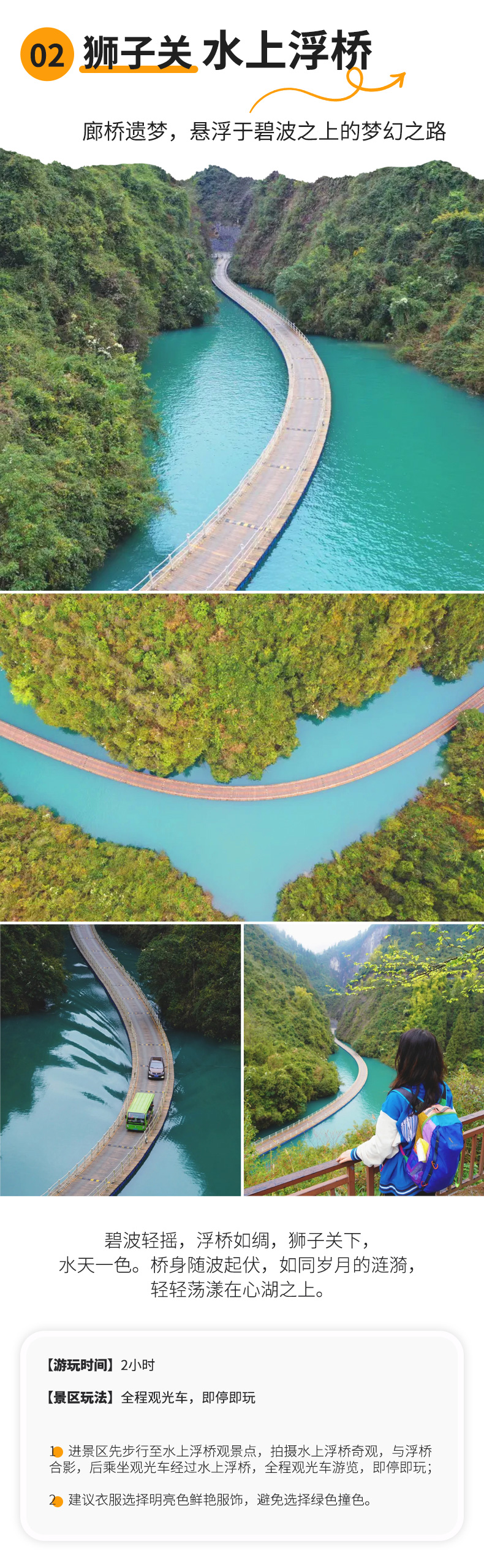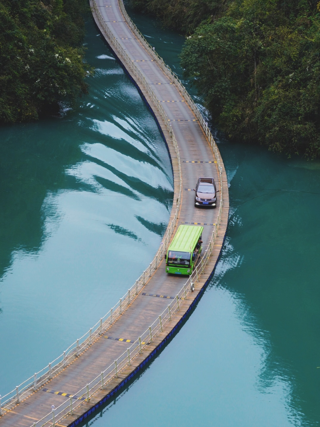 我们将带领大家前往浮桥全景拍摄处,从此地俯瞰下去,整条河流呈现出一道半圆弧+S形走向,就像镶嵌在两座山峰之中的绿宝石,弯弯曲曲地伸向远方,最后消失在视线之外。随后,我们漫步在【网红悬浮桥】上,感受水浪的波动。