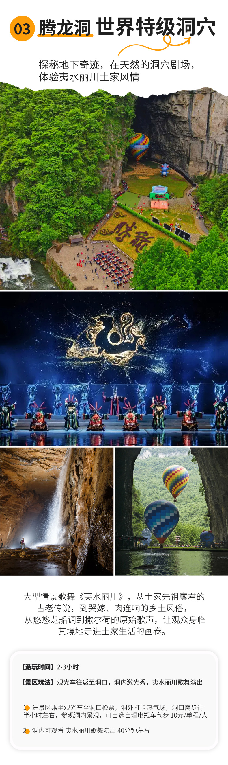 洞内可观赏全国最大的原生态洞穴剧场《夷水丽川》,由国内顶级导演精心编排,利用腾龙洞的世界级地质景观为实景剧场,以土家文化为背景的大型情景歌舞,配以数字大屏、舞台灯光、雾森、升降舞台、移动吊脚楼、廊桥、水中龙船,在感受腾龙洞震撼之美的同时,还可领悟到土家族原始而又古老的民族歌舞风情。