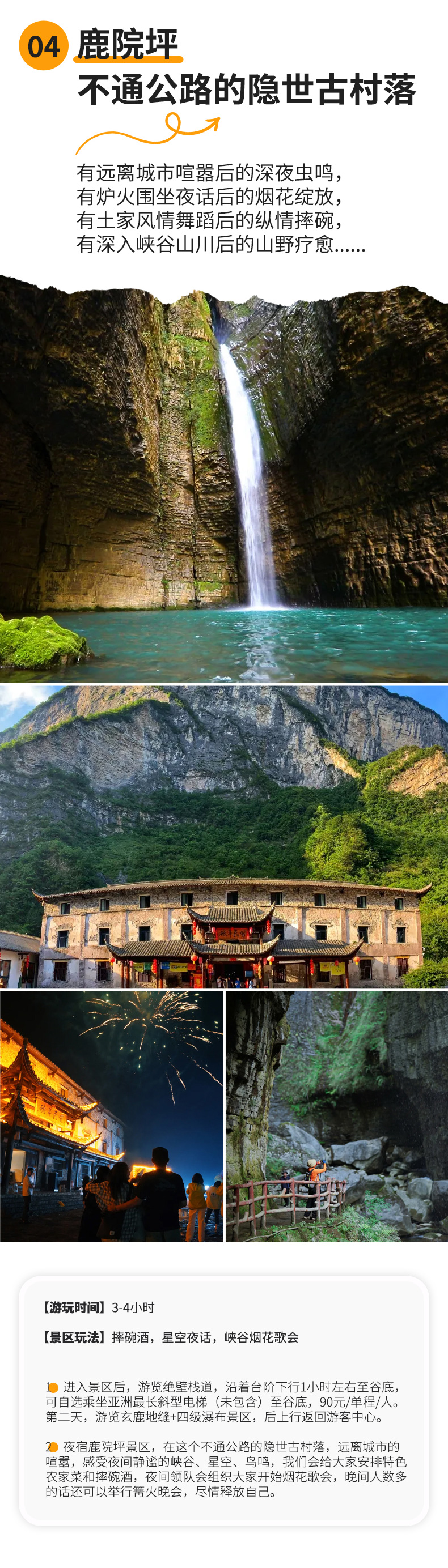 上午,我们将游玩鹿院坪这个与“鹿“结缘的传统村落景区,徒步玄鹿地缝,这是一条幽长静谧、清凉的峡谷,峡谷里面有着一条小溪流和多处瀑布,有着被当地人称为“水帘洞”的四级瀑布,都是绝色美景。