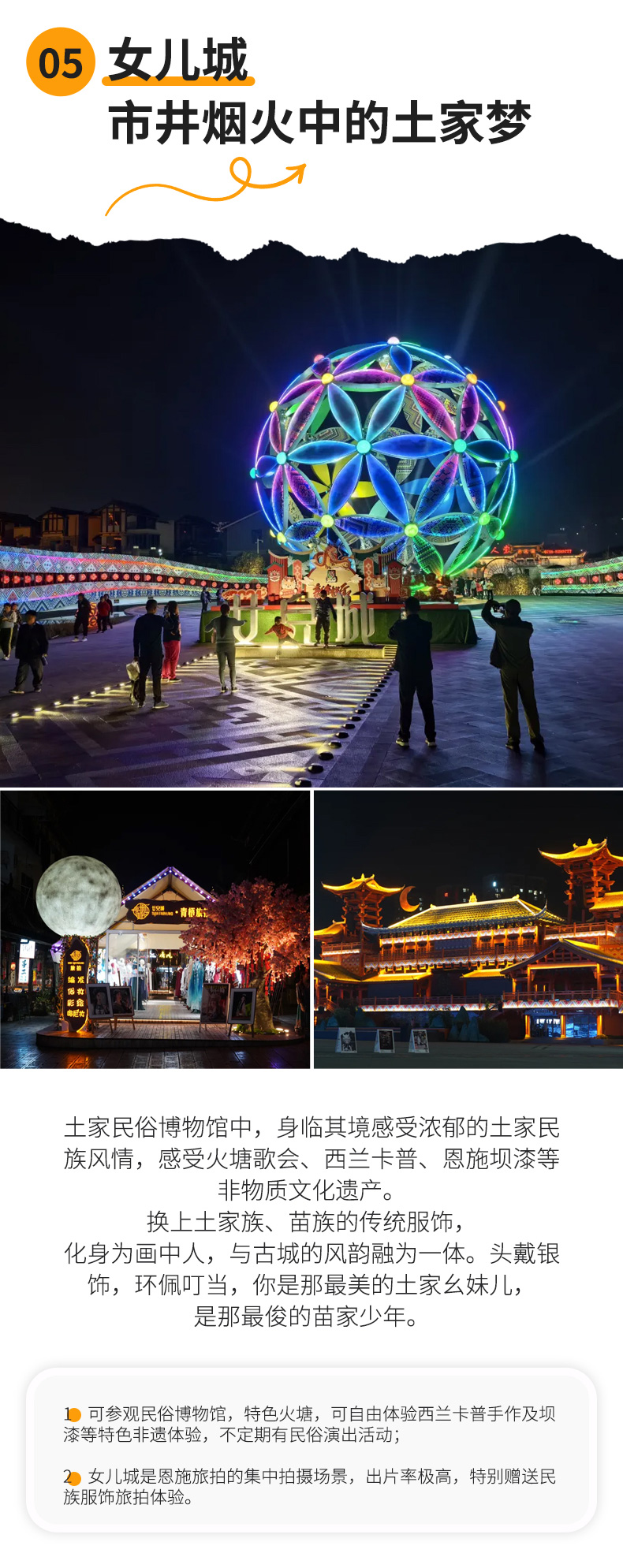 晚上,我们前往“世间男子不二心,天下第一女儿城”的土家女儿城,去民俗博物馆看看土家人民的生活场景。晚上7点多,更有大型室外情景区《赶场相亲会》表演可以观看。