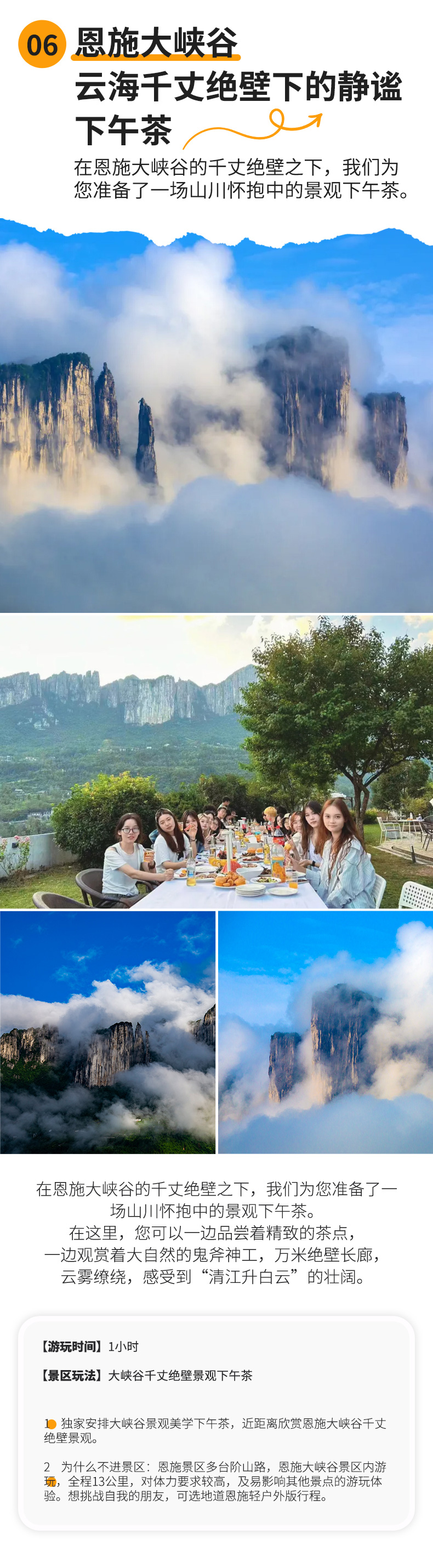 我们将在恩施大峡谷的千丈绝壁之下,我们为您准备了一场山川怀抱中的景观下午茶。在这里,您可以一边品尝着精致的茶点,一边观赏着大自然的鬼斧神工,万米绝壁长廊,云雾缭绕,感受到“清江升白云”的壮阔。
