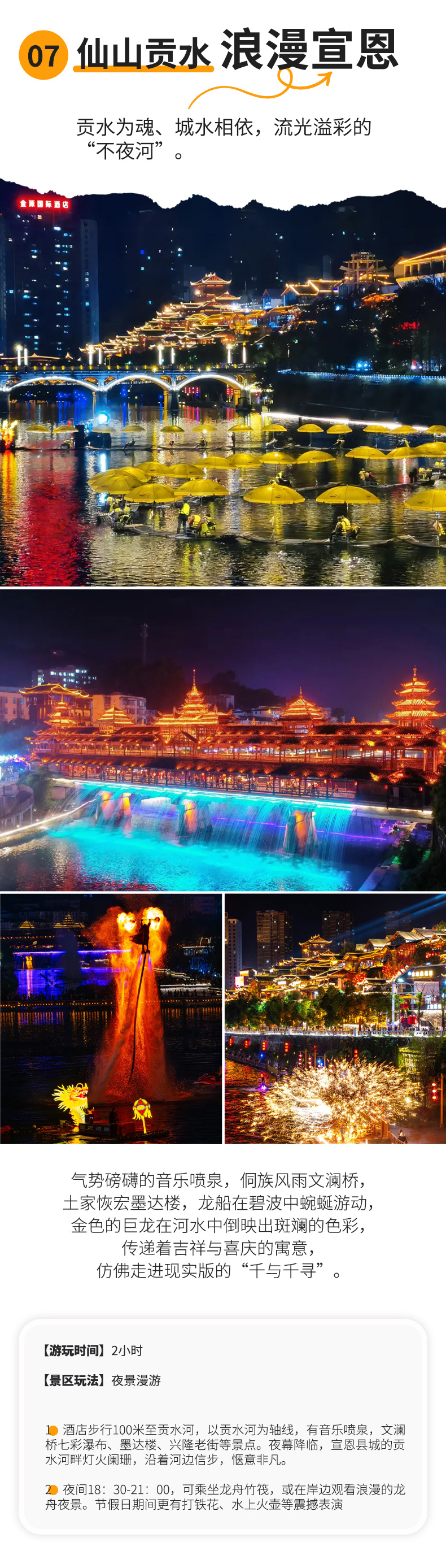 在宣恩这个浪漫小城,一河两岸,灯光璀璨,半城烟火半城仙。国内最长的音乐跑泉在此欢快跳跃,宛如仙女的丝带在空中舞动。晚上去体验特色宣恩烤活鱼,再漫步贡水河畔,走上风雨文澜桥,感受恩施小洪崖洞浪漫夜景。