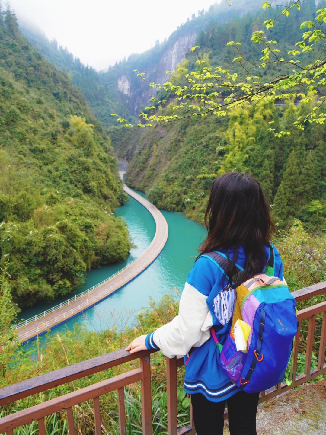 沿着依山而开的栈道前行,或穿行于蜿蜒的石阶小路之间,面前一座座山峰层层叠叠,或庞大稳重,屹立不倒;或壁如刀削,直耸云端。在这一段峡谷里旅行,伸手可及石壁,石壁上的连绵青苔,碧绿柔软;栈道下的河水,浪花雪白;回水潭里的莹莹碧水,澄澈明净。