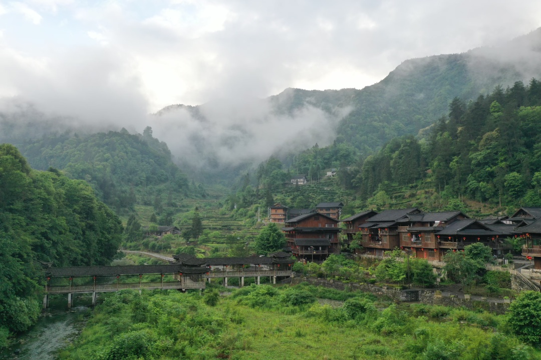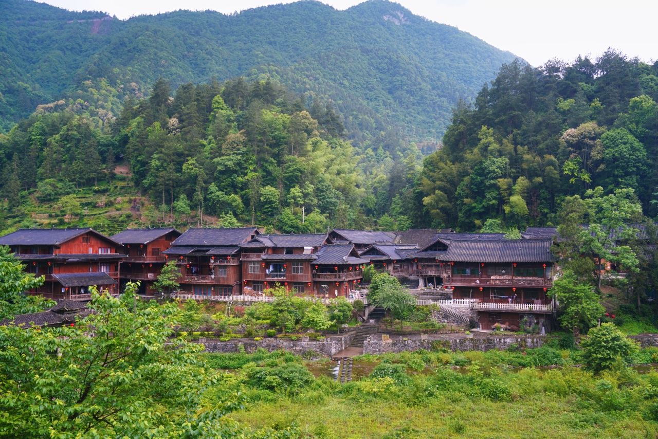 这里以其保存完好的古建筑群而闻名,主要是干栏式吊脚楼,寨中建有鼓楼,溪上架有风雨桥,展现出浓郁的民族传统风韵。村前有溪,溪绕村庄,有着木墙黛瓦的朴素、青山碧水的清纯、田园风光的恬然。掩映在竹木林中的吊脚木楼,如串珠相连、星星点缀在山间。