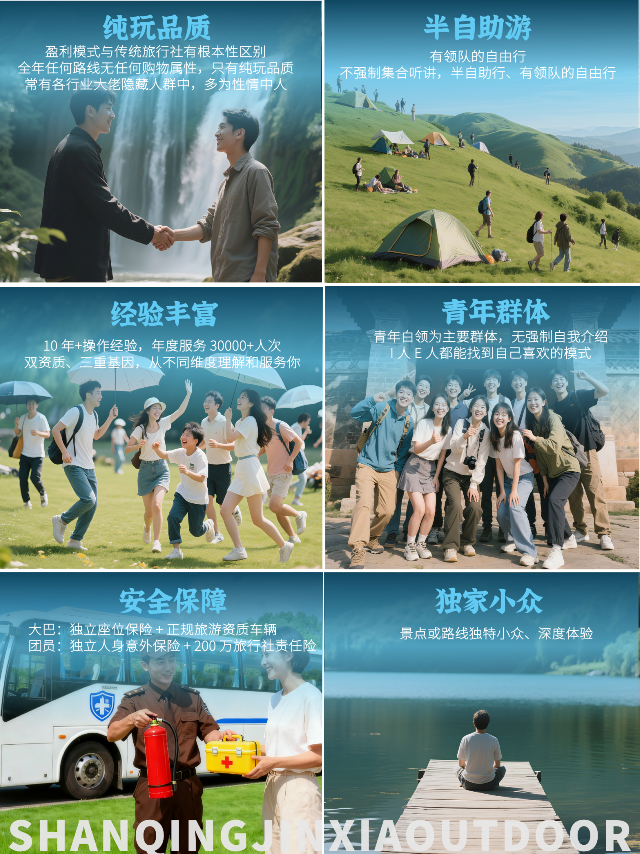 纯玩品质说明:山青尽夏成立至今 10 余年,无论短线/长线从未组织过任何含有诱导性/强制性购物的线路和团期,始终坚持只获取正当所得利润,若遇司机/领队违规操作,请即刻致电后台监管为您处理