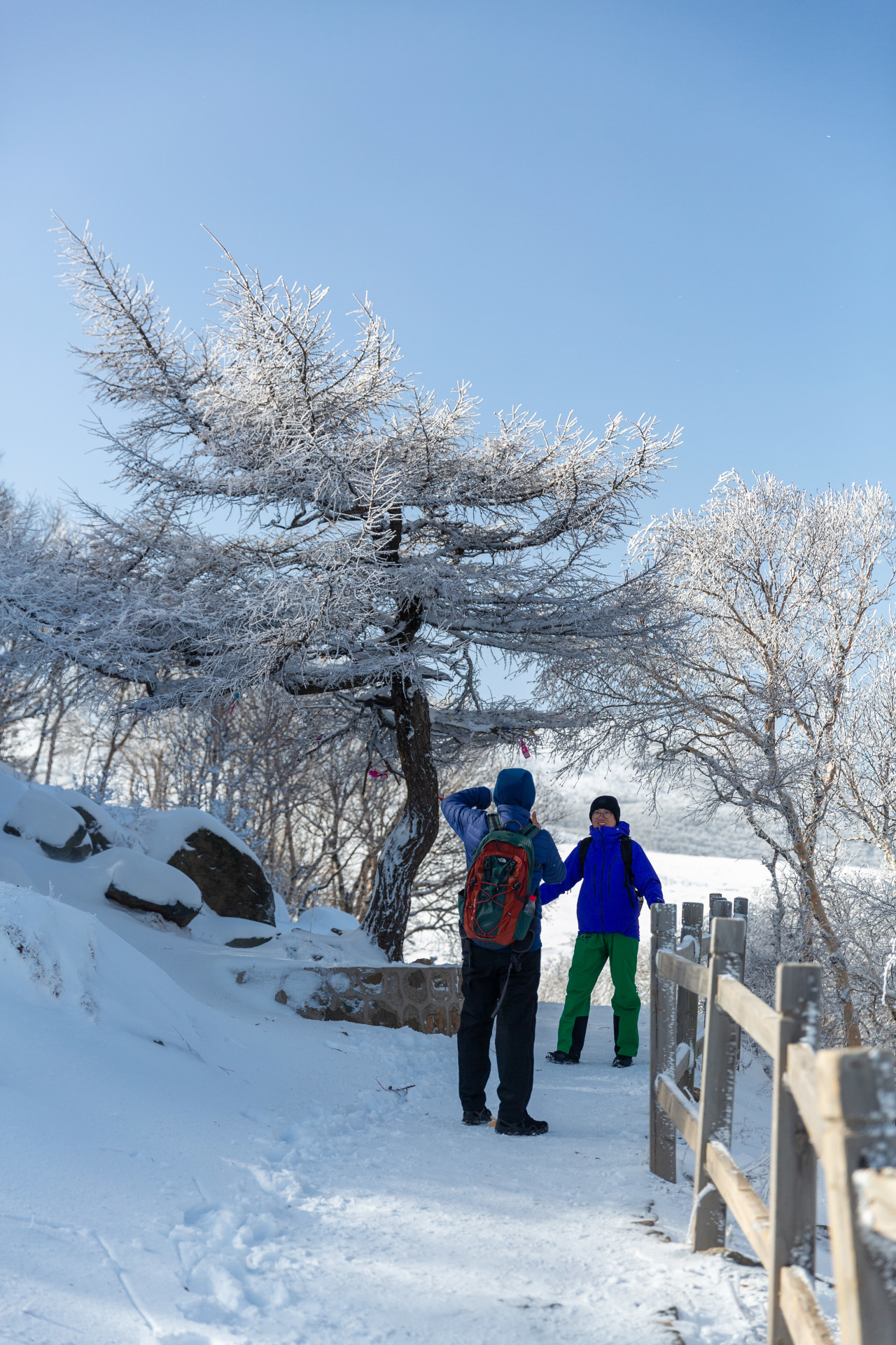 到了灵山你会看到漫山的雾凇,走在树林里看着树枝上挂满雪,在树林里来一张大片,特别有意境。走在山顶一望无际的茫茫雪原,瞬间就感觉到天地间都属于自己,此刻所有的一切都属于自己,疯狂的想把这些美景都复刻在自己脑子里。