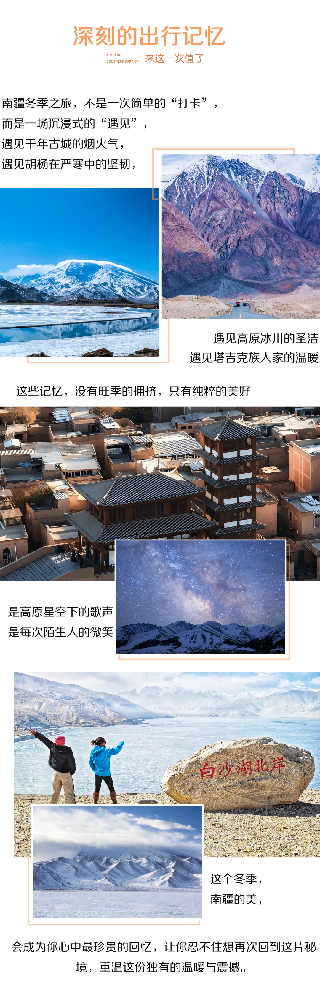 早起从喀什出发,沿中巴公路前往塔县。途中首先会途观奥依塔克红山,冬季的红山在白雪映衬下,红褐色山体更显雄浑,宛如一幅大气的油画,可在观景台短暂停留拍照。继续前行抵达白沙湖,冬季的湖面平静如镜,碧蓝湖水倒映着白雪覆盖的白沙山与远处雪山,天地间只剩蓝与白的纯净,可沿湖边漫步,感受高原的静谧辽阔。傍晚抵达塔县后,前往塔吉克族人家进行家访。主人会端上特色糕点和茶,热情招待远方来客。你可以换上塔吉克族传统服饰,跟着主人学习简单的塔吉克舞蹈,在欢声笑语中感受高原民族的淳朴情谊。家访结束后,前往酒店办理入住。