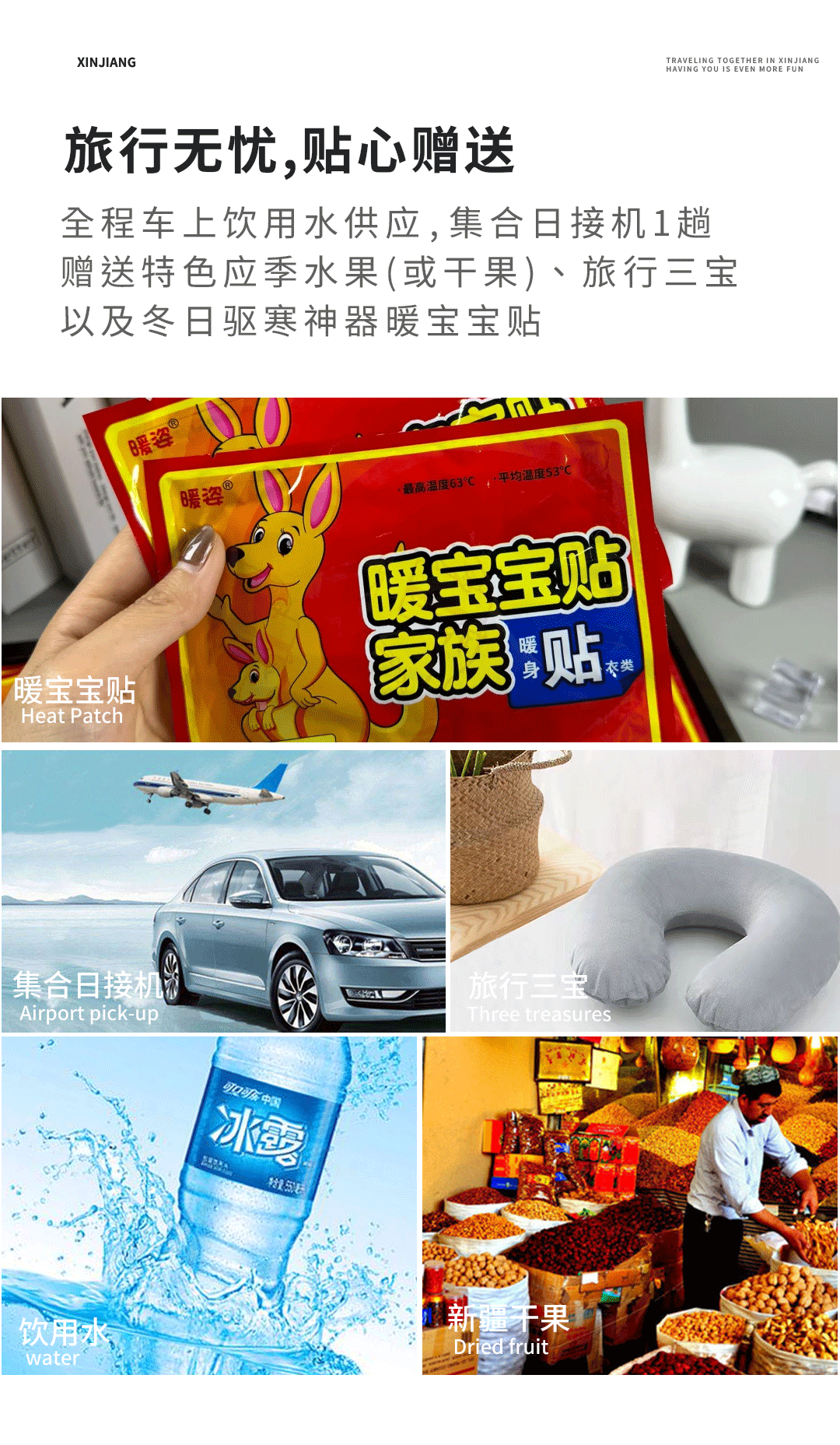 1. 新疆地域宽广,每天的行车时间比较长,请提前做好准备哟。另外为了避免肚饿,可以自备一些小零食。