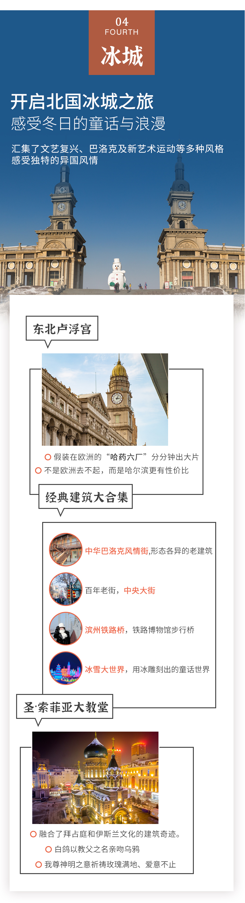 08:30 正式开启北国冰城之旅。车览火到霸屏的【哈药六厂】金碧辉煌堪称“东北卢浮宫”,漫步【中华巴洛克风情街】,行走在这里的数十条老弄堂里,随处可见建于20世纪初的巴洛克风格建筑,形态各异的老建筑,风格不同的建筑装饰,以及街头的民俗雕塑,勾勒成一道怀旧岁月的场景。想要了解这座城市的前世今生,怎么少得了百年【中央大街】, 全街汇集了文艺复兴、巴洛克及新艺术运动等多种风格,建筑是岁月的时钟,融入了这座城市古老的生活秩序,辗转不同的楼宇,感受独特的异国风情,老房子看得见风景,更看得见传奇。象征着和安宁的白鸽,环绕在【防洪纪念塔】周围,仿佛告诉先人如今的祥和,向人们诉说她存在的意义;始建于1900年的【滨州铁路桥】历经113年风霜完成了历史使命,改作铁路博物馆步行桥,钢筋铁骨重新粉刷灯光也在江上亮起,成为了新晋网红打卡地。【圣·索菲亚大教堂】是哈尔滨发给世界的邀请,来到这座浪漫之城,就千万不要错过这场唯美的约定。蜿蜒逶迤至遥远的拜占庭,清水红砖不知是多少人的近乡情怯,窿顶苍穹有萦绕着多少他乡思念,这里虽四季分明,但从来不缺热情。