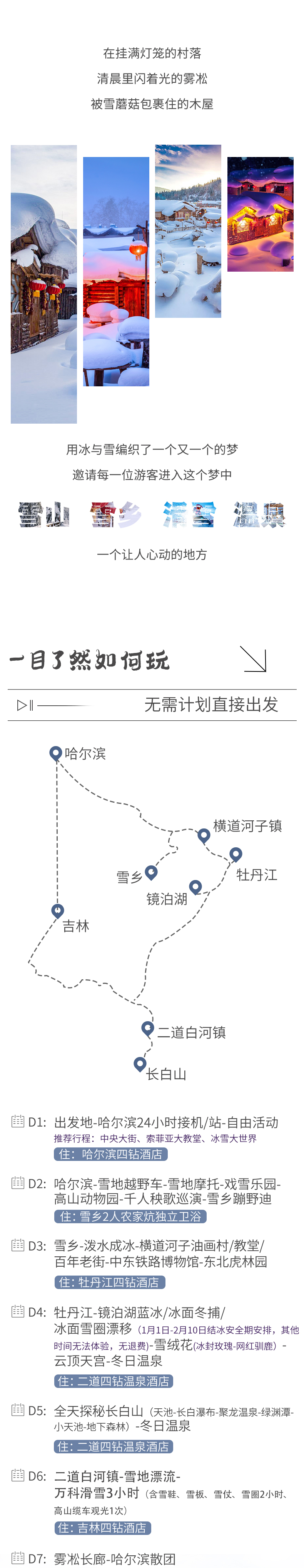 1.2米以下为儿童,含车位费、含滑雪、含雪乡炕位、赠送项目、保险、免门票、免早餐,不含酒店住宿、不含雪地漂流,超高但未满12周岁需补门票381元+早餐费200元+温泉176元,如需占床补酒店费用800元床位费含早餐含温泉, 1晚雪乡农家炕如想单住请现询客服。 升级轻奢版补房差1200元/人 哈尔滨参考哈尔滨新巴黎或同级 雪乡参考雪筑遇见/纳山纳雪/雪韵假日/万嘉森林或同级 牡丹江参考夏威夷/世贸假日或同级 二道白河参考王朝圣地酒店或同级 吉林参考世贸万锦/戴斯温德姆/紫光苑华美达或同级 备注:升级酒店差价、升级后儿童早餐费用和温泉费用,以客服回复为准 | ||||