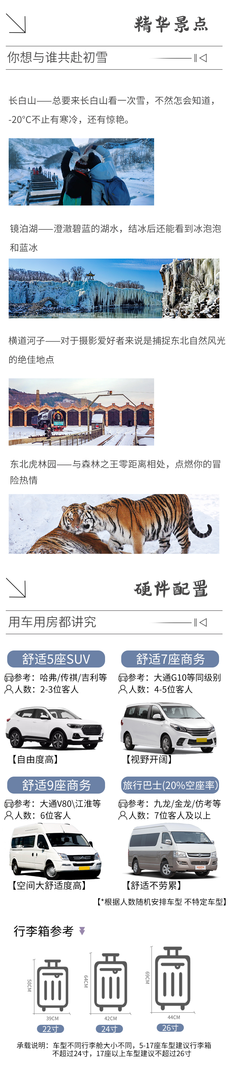 4、门票:吉林万科3小时滑雪包含雪鞋雪板雪杖使用、雪乡门票+往返环保车、东北虎林园门票+环保车、长白山门票+往返环保车+区间车+倒站车、雪地漂流门票、雪绒花门票;