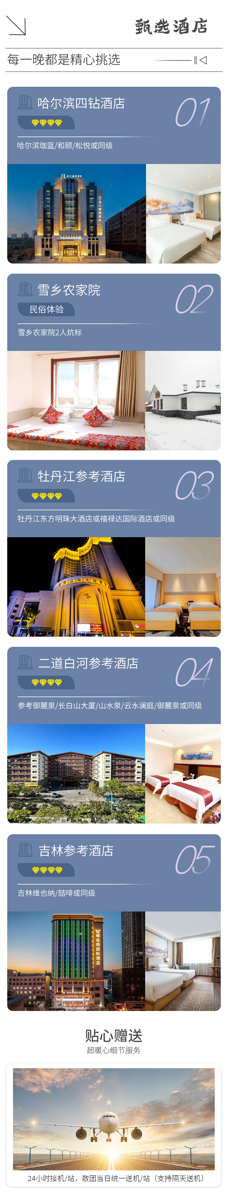 1.2米以下为儿童,含车位费、含滑雪、含雪乡炕位、赠送项目、保险、免门票、免早餐,不含酒店住宿、不含雪地漂流,超高但未满12周岁需补门票381元+早餐费200元+温泉176元,如需占床补酒店费用1200元床位费含早餐含温泉, 1晚雪乡农家炕如想单住请现询客服。 升级轻奢版补房差1400元/人 哈尔滨参考哈尔滨新巴黎或同级 雪乡参考雪筑遇见/纳山纳雪/雪韵假日/万嘉森林或同级 牡丹江参考夏威夷/世贸假日或同级 二道白河参考王朝圣地酒店或同级 吉林参考世贸万锦/戴斯温德姆/紫光苑华美达或同级 备注:升级酒店差价、升级后儿童早餐费用和温泉费用,以客服回复为准 | ||||