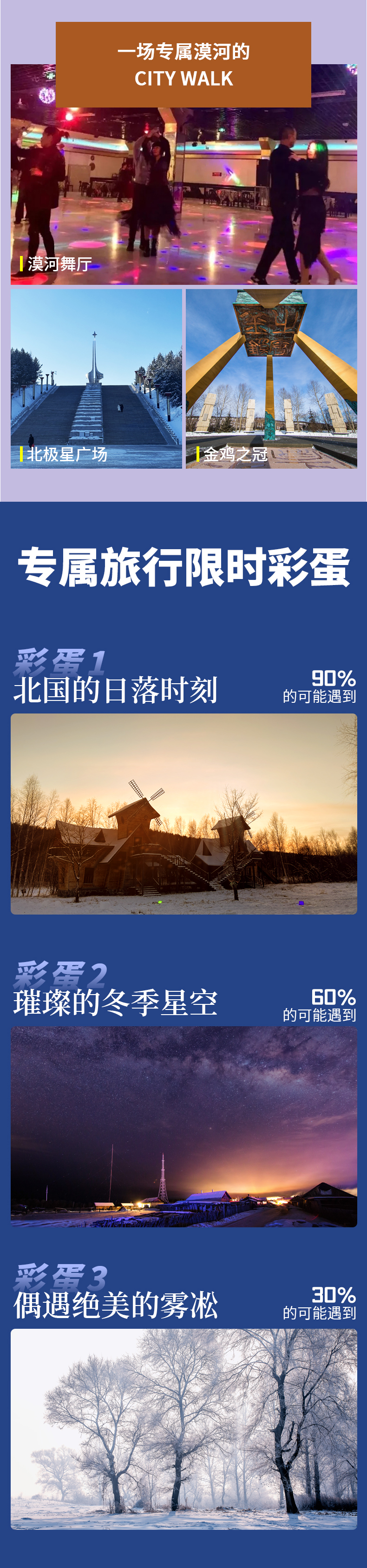 4、门票:龙江第一湾门票+环保车、圣诞村门票、2小时滑雪(含雪鞋/雪板/雪杖使用)、北极村门票、鄂温克驯鹿园;
