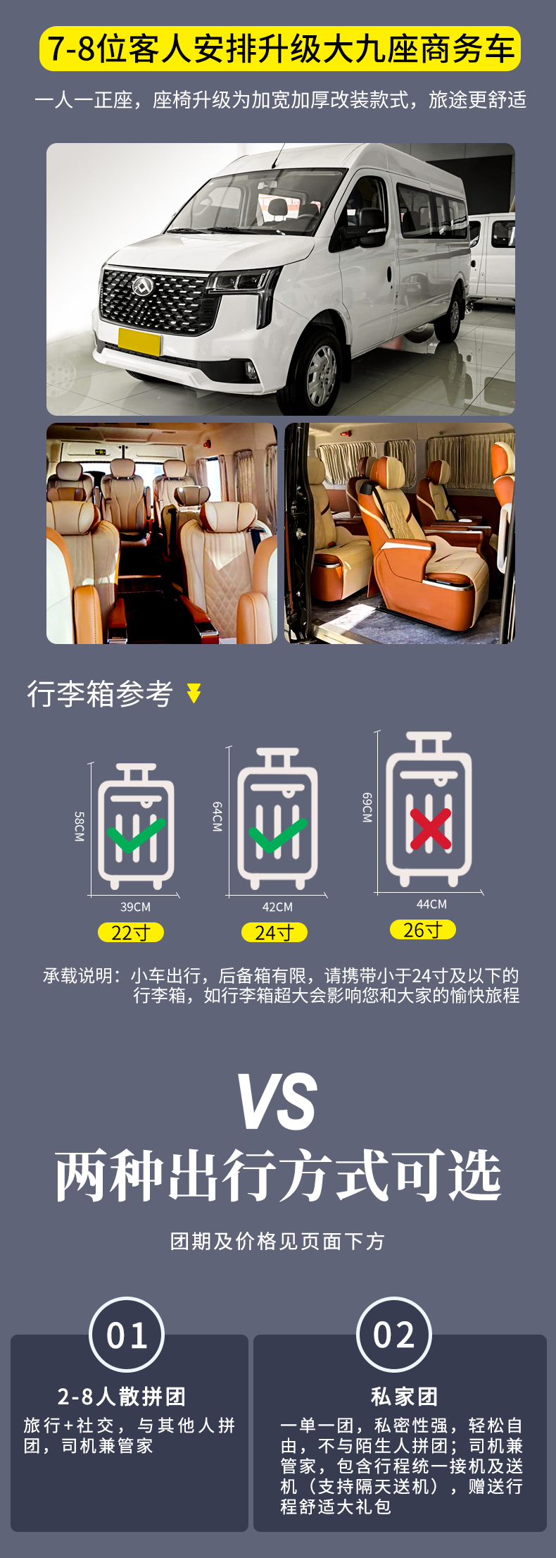 3、用车:2-3客人用5座SUV,4-5客人用7座商务车,6客人用9座商务车,7-8客人用大九座商务车,根据人数安排用车大小,不指定用车(小团副驾驶及前后座位置需要轮流乘坐,望悉知)