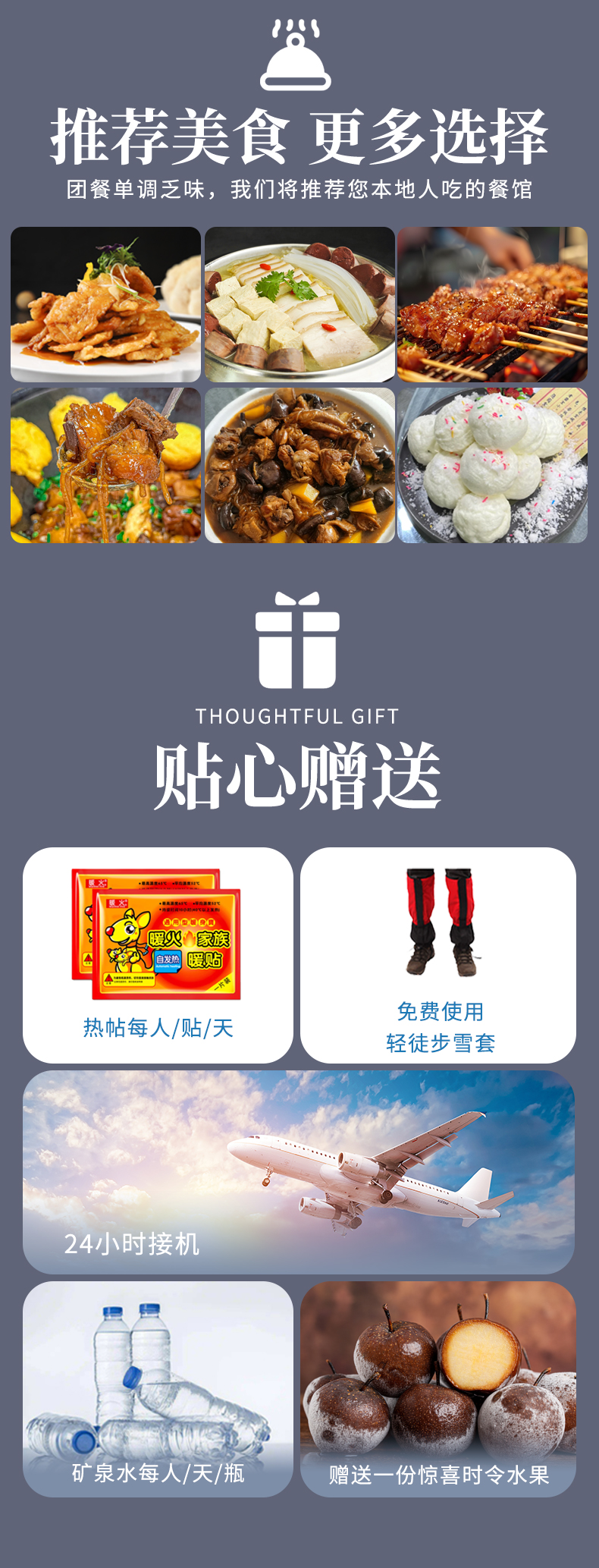 4、赠送热帖每天一人1片,矿泉水每天一人1瓶;赠送1份惊喜时令水果(行程中赠送一次)