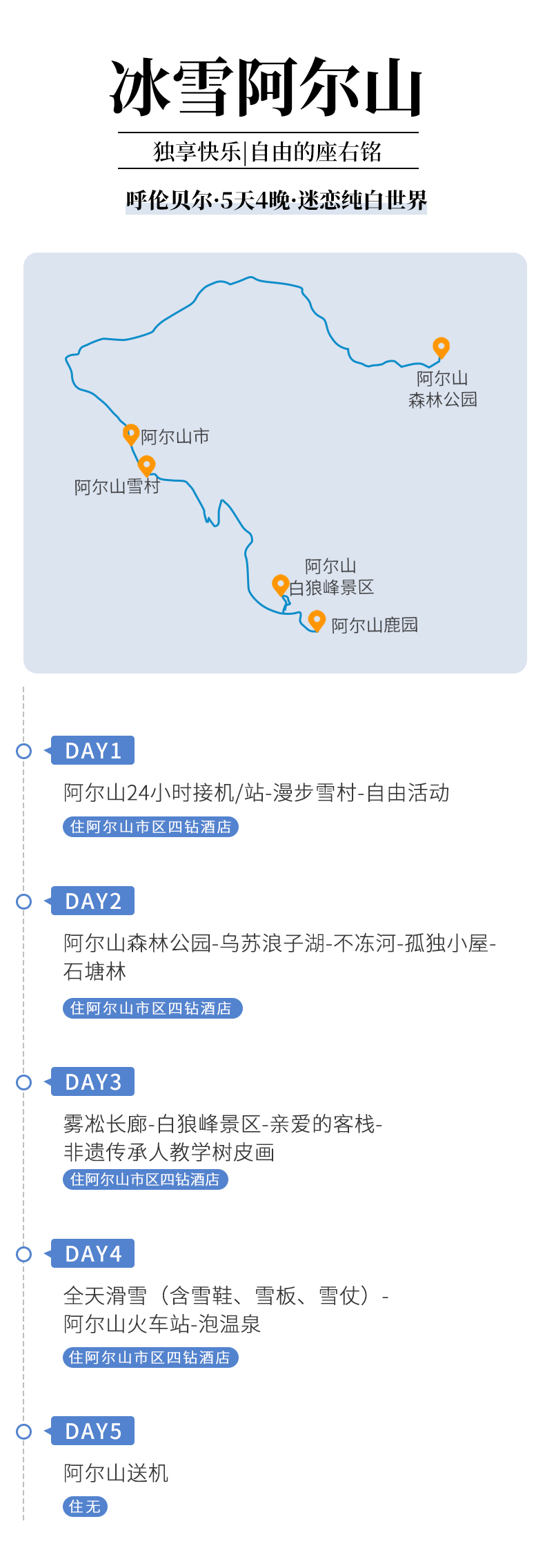 4、门票:阿尔山鹿园、阿尔山雪村、阿尔山森林公园(含景交车)、白狼峰(含景交车)