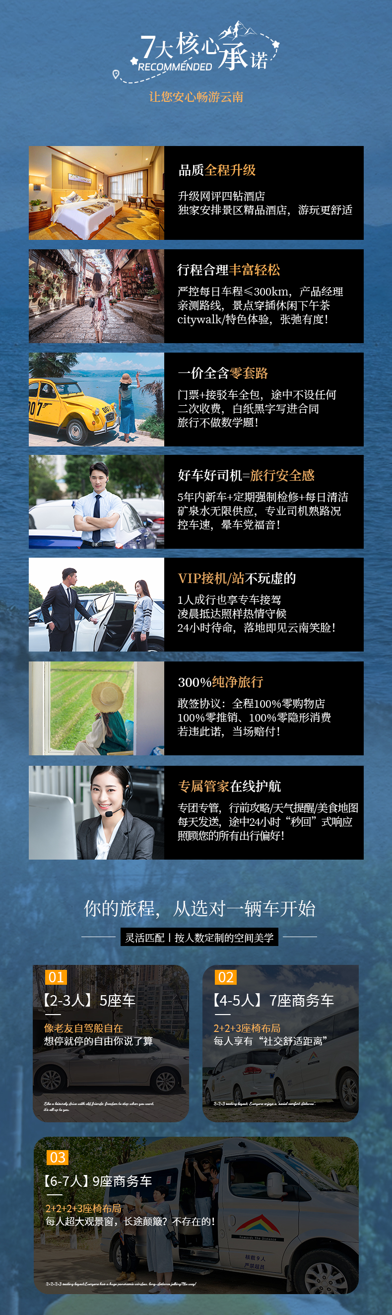 3、用车:2-3人安排5座,4-5人安排7座商务车,6-7人安排9座商务车;