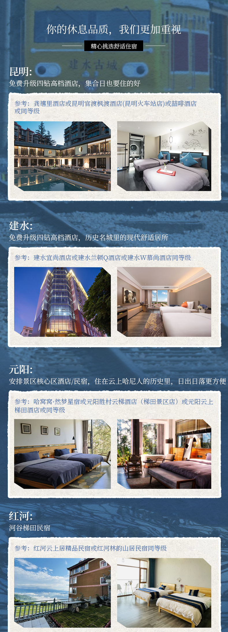 1、住宿:住宿:昆明四钻酒店1晚(参考:昆明枫渡酒店(昆明站官渡万象城店)或喆啡酒店或龚禧里酒店或同等级),建水四钻1晚酒店(参考:建水兰顿Q酒店或宜尚酒店或同等级),元阳三钻1晚酒店(参考:哈窝窝·然梦星宿或元阳胜村云梯酒店(梯田景区店)或同等级),红河三钻1晚酒店(参考:红河云上居精品民宿或红河林韵山居民宿或同等级);