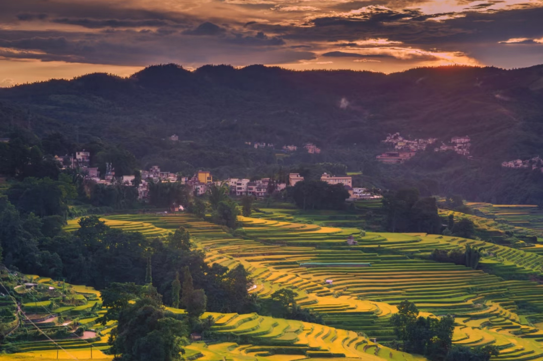 18:00 等候【坝达梯田·日落】,霞光泼进三千级梯田的刹那,液态黄金在等高线上疯狂奔流。风把云海撕成锻打中的红铜箔片,而田埂化作冷却的坩埚边沿——此刻,落日正将群山按进自己的砧座捶打。