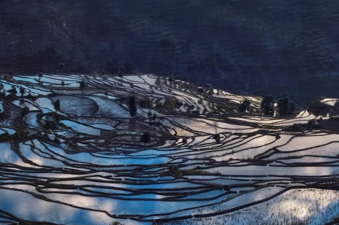 09:00 前往【爱春·蓝梯田】,水镜将蓝靛草的基因链熔化成液态宝石,哈尼少女的银饰掠过田埂,划开一道靛青伤口——那是天神遗落的丝绸衬里,正随云影流速缝合群山。