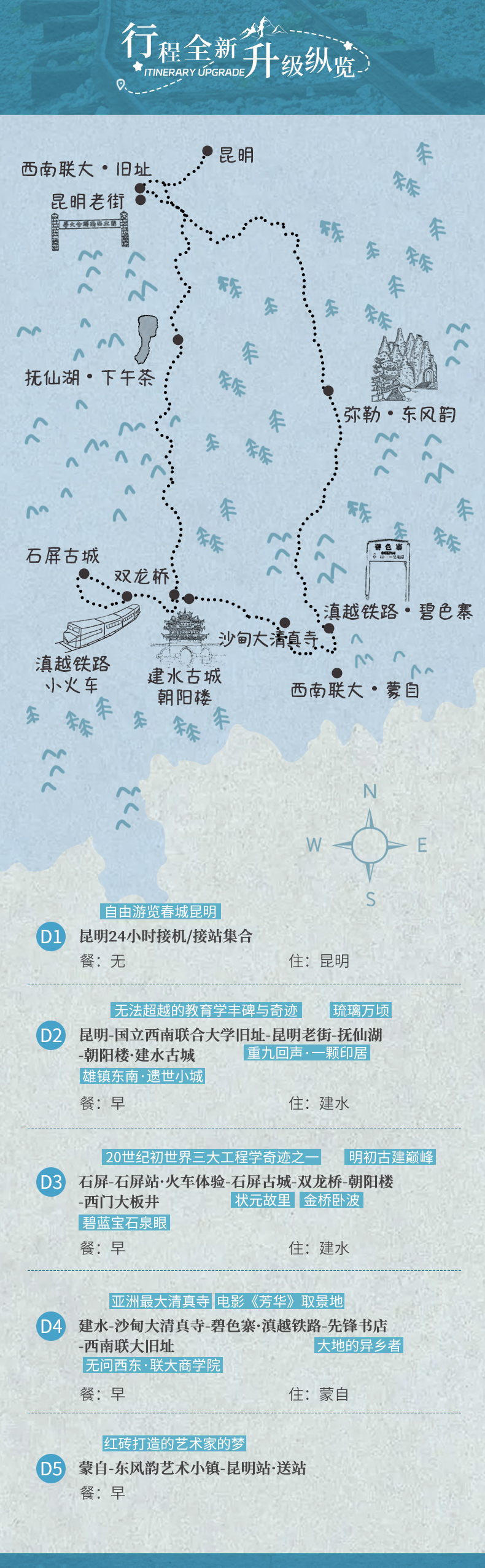 4、门票:石屏小火车、碧色寨(含电瓶车),东风韵艺术小镇(含电瓶车);