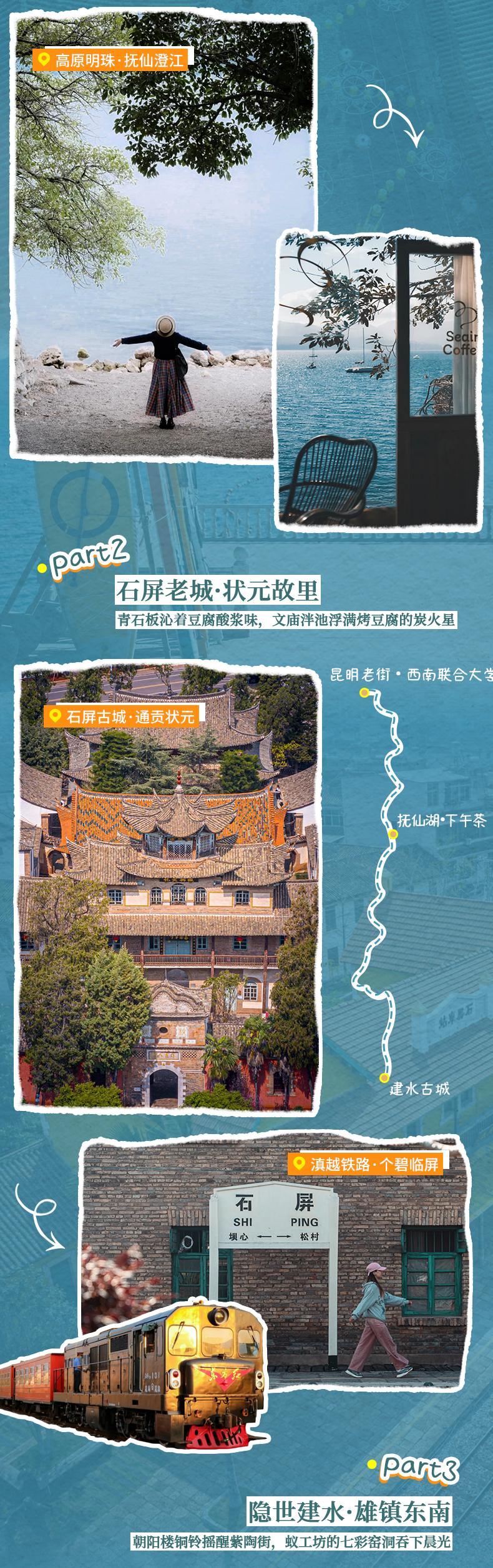 09:30 抵达【石屏古城】之中文庙泮池倒映的晚清卷棚顶下,豆腐作坊酸浆味蚀穿了科举榜单。跟着戴锡箔帽的老妪拐进袁嘉谷故居,她的布鞋底沾着万历年的朱砂印泥——当夕阳点燃异龙湖的苇荡,整座古城在豆渣香里微微发颤。古城旁的【石屏站】,法式黄墙的裂痕里渗出1910年的蒸汽。当窄轨列车碾过被藤蔓绞紧的铆钉,百年枕木突然在臀下震颤如蛇骨。窗外掠过甘蔗田与废弃锡矿——殖民者的野心,正被彝族农妇的背篓压成生锈的轨道。一场奇幻的【火车体验】也就在这个时候出发,让风吹过时间,向前出发。