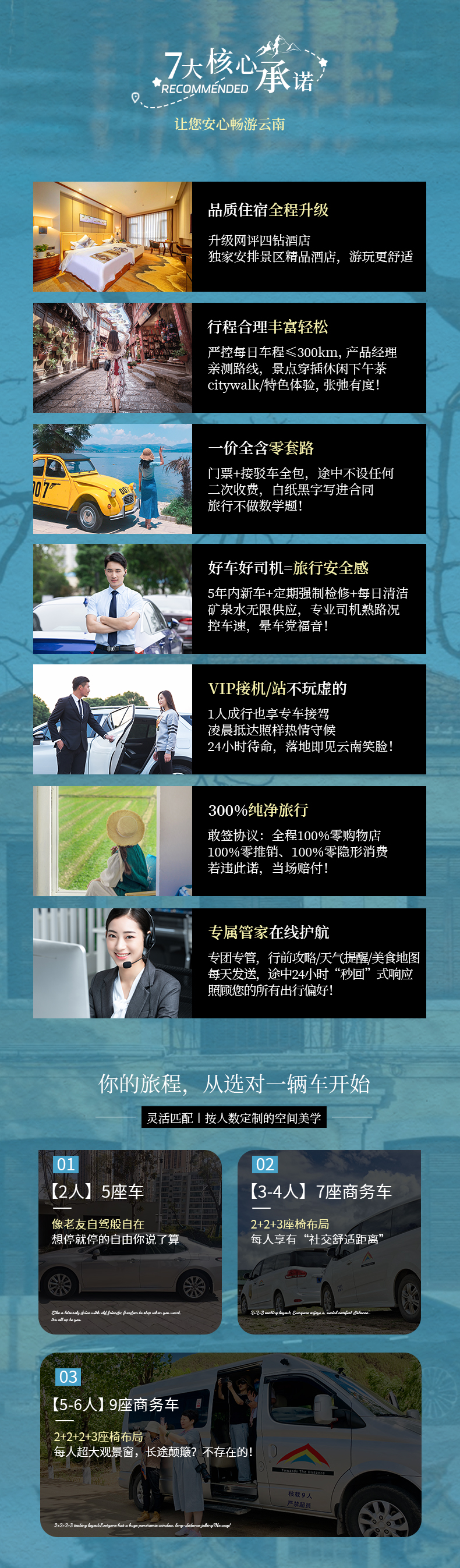 3、用车:2人安排5座,3-4人安排7座商务车,5-6人安排9座商务车;