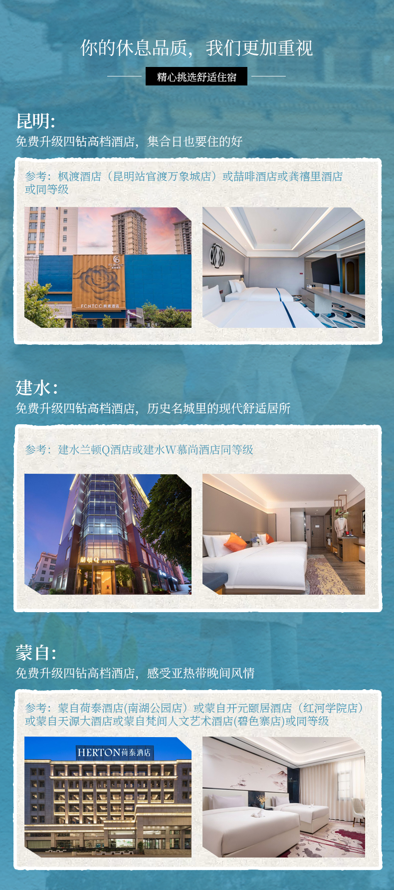 1、住宿:昆明四钻酒店1晚(参考:昆明枫渡酒店(昆明站官渡万象城店)或喆啡酒店或龚禧里酒店或同等级),建水四钻2晚酒店(参考:建水兰顿Q酒店或宜尚酒店),蒙自四钻1晚酒店(参考:蒙自荷泰酒店(南湖公园店)或蒙自开元颐居酒店(红河学院店)或蒙自天源大酒店或蒙自梵间人文艺术酒店(碧色寨店)或同等级);
