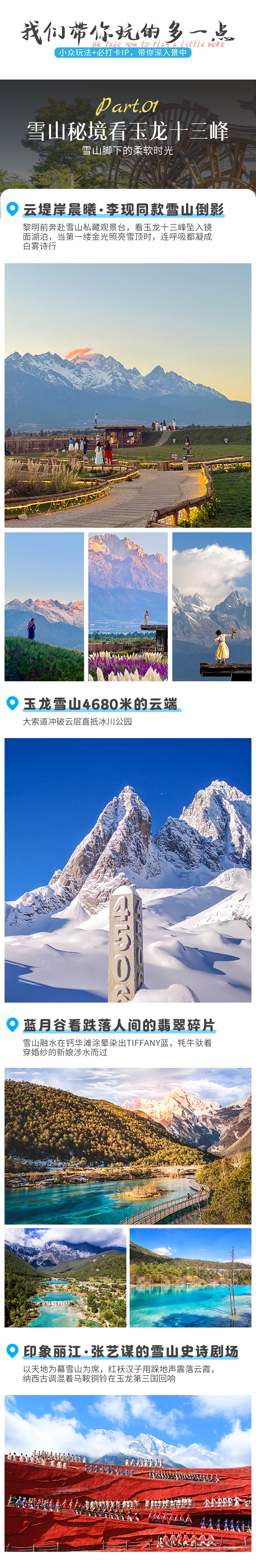 2、玉龙雪山行程为参考行程,玉龙雪山大索道时间是随机的(索道时间由索道公司出票时间为准),没办法准确控制在几点哦。