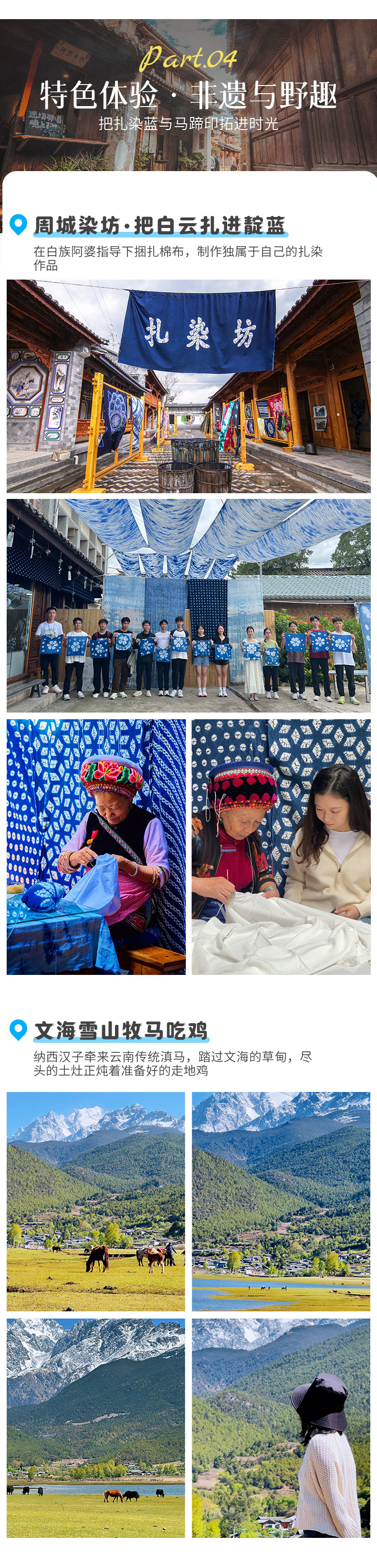 4、门票:玉龙雪山套票(含进山费+古维费+景交+大索道+印象丽江),扎染体验,文海骑马;