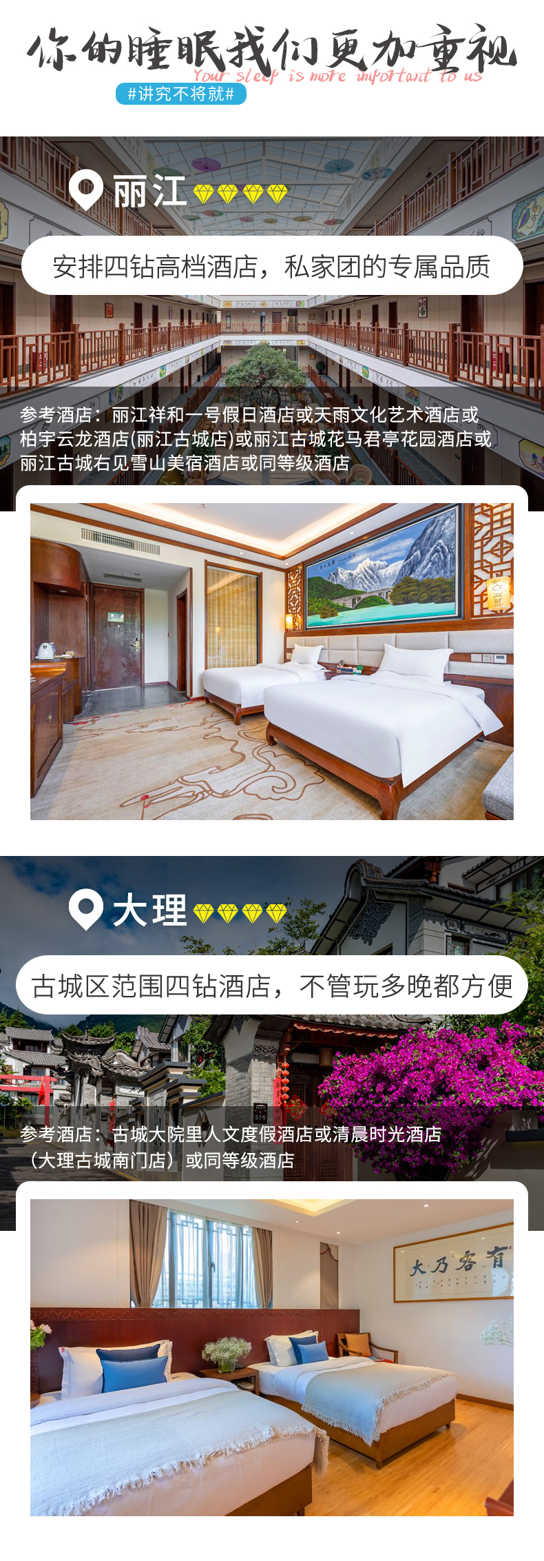 1、住宿:大理四钻酒店2晚(参考:古城大院里人文度假酒店或清晨时光酒店(大理古城南门店)或同等级),丽江四钻酒店2晚(参考:丽江祥和一号假日酒店或天雨文化艺术酒店或柏宇云龙酒店(丽江古城店)或丽江古城花马君亭花园酒店或丽江古城右见雪山美宿酒店或同等级);