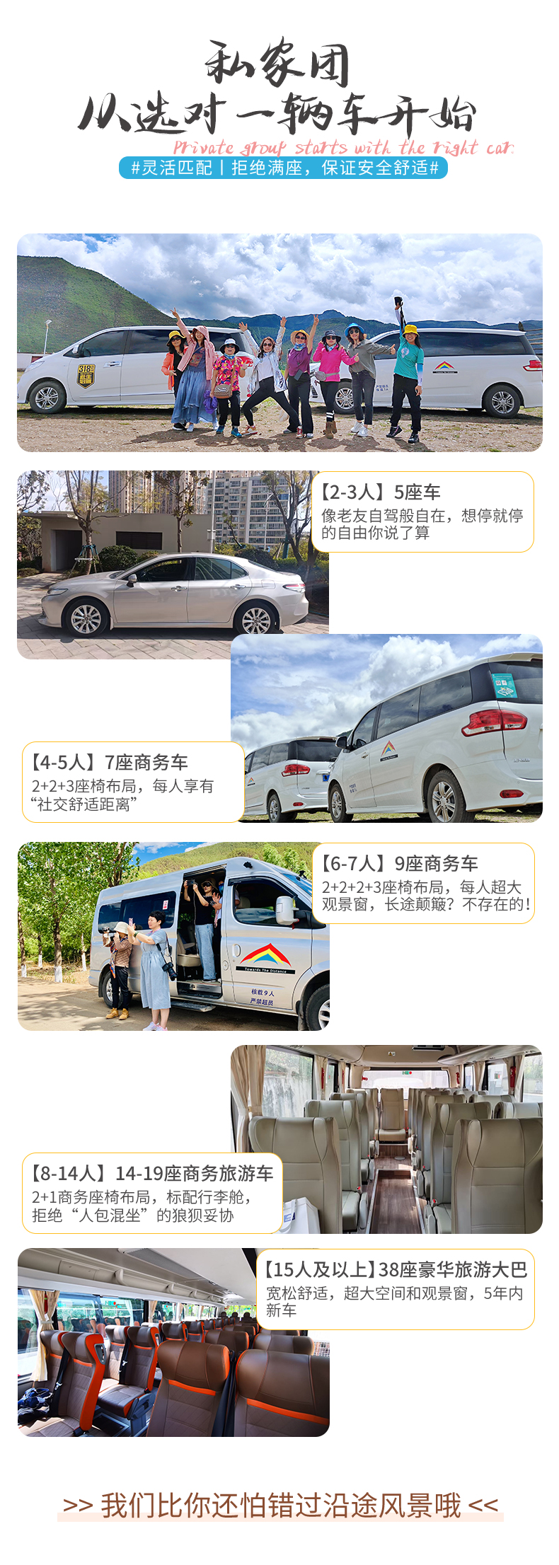 5、司导:2-7人司机兼管家(帮助大家购买门票,给团友游玩建议,无法全程陪同进入收费景区和提供专业讲解等服务,敬请谅解),8人及以上安排1名专职导游全程带队;