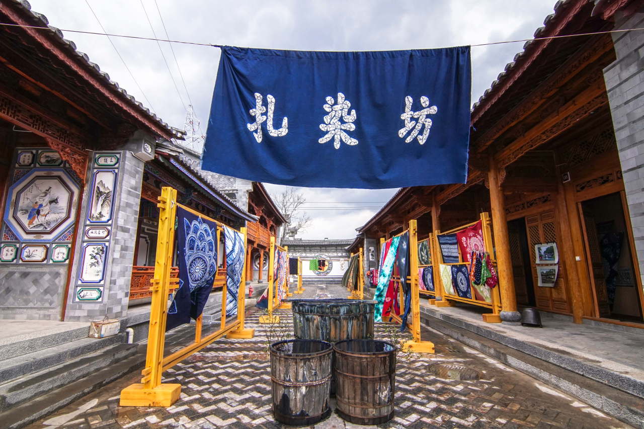13:00 前往【周城村】,百年老院【古法扎染】,阿奶手把手教您将白布捆扎成蝴蝶、苍山纹样,浸入板蓝根发酵的靛蓝染缸,体验不一样的大理时光。