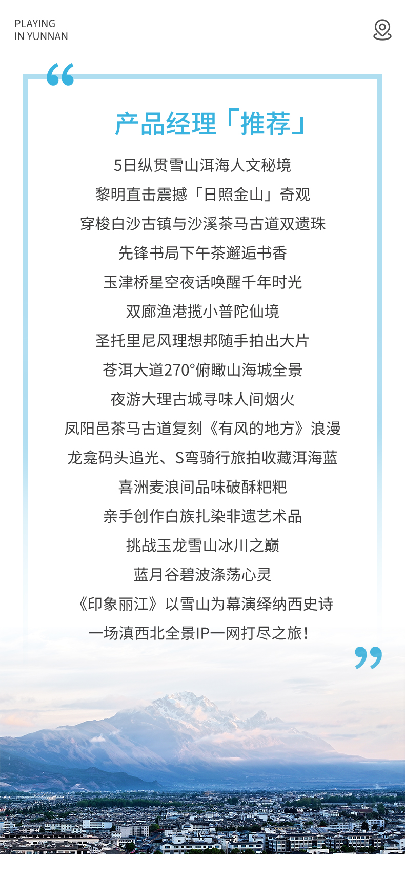 4、若大索道出票时间在下午时段,上午行程将前往蓝月谷的游玩,如旅游旺季由于景区人流量较大导致排队等待时间较长,敬请谅解,保持平常心对待。