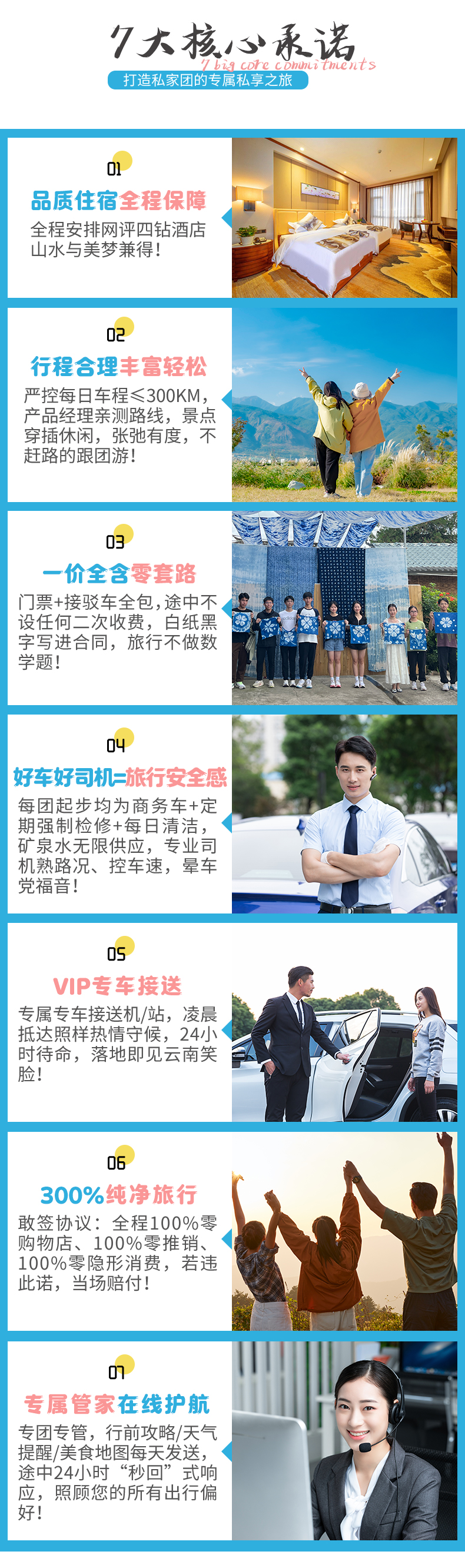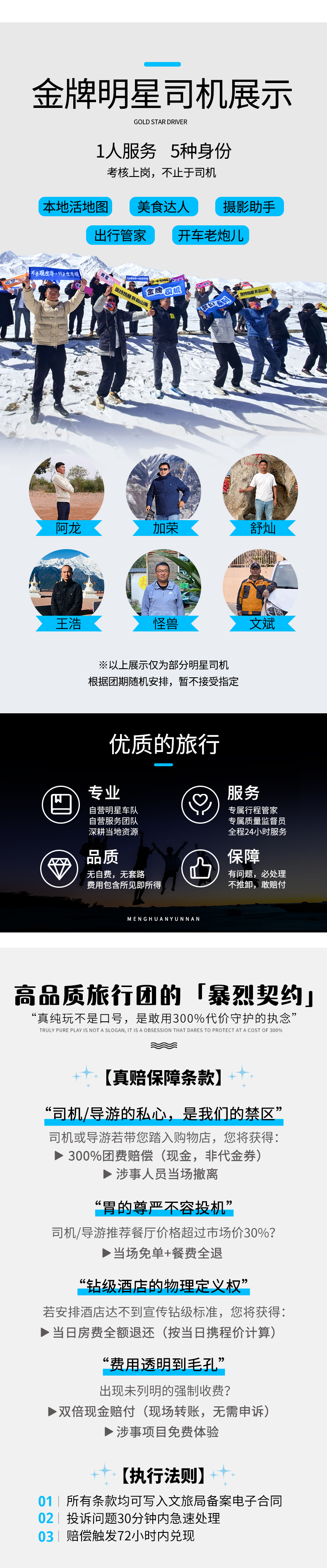 5、司导:2-7人司机兼管家(帮助大家购买门票,给团友游玩建议,无法全程陪同进入收费景区和提供专业讲解等服务,敬请谅解),8人及以上安排1名专职导游全程带队;
