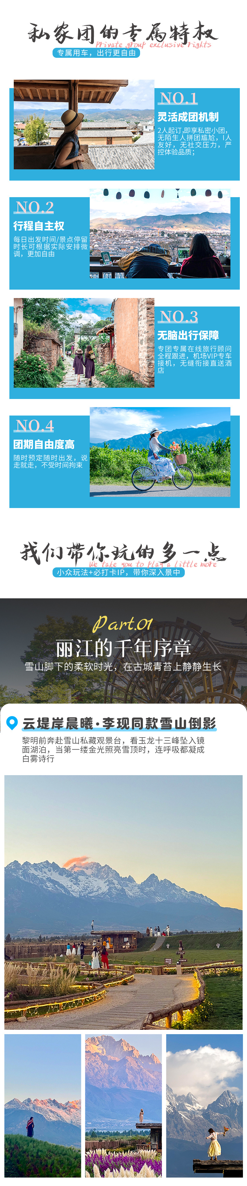 2、玉龙雪山行程为参考行程,玉龙雪山大索道时间是随机的(索道时间由索道公司出票时间为准),没办法准确控制在几点哦。
