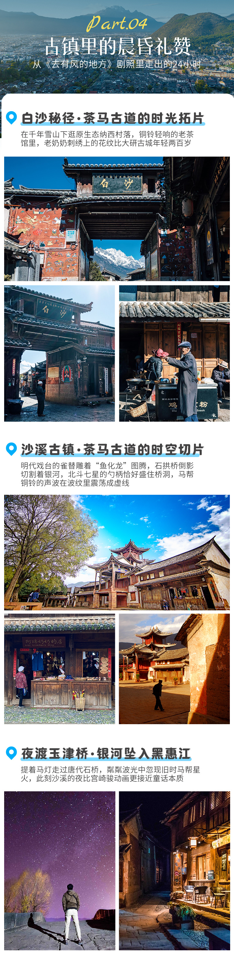 丽江-云堤岸-日照金山-白沙古镇-石宝山-沙溪-先锋书店-下午茶-寺登街-玉津桥-夜游沙溪(约110KM,车程约1.5小时)