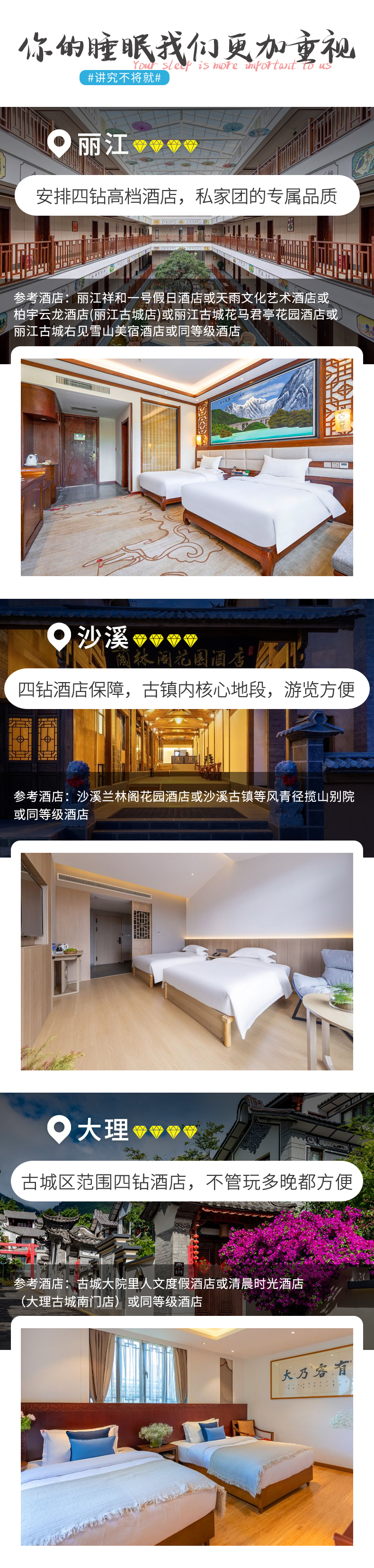 1、住宿:丽江四钻酒店2晚(参考:丽江祥和一号假日酒店或天雨文化艺术酒店或柏宇云龙酒店(丽江古城店)或丽江古城花马君亭花园酒店或丽江古城右见雪山美宿酒店或同等级),沙溪民宿/客栈1晚(参考:沙溪兰林阁花园酒店或沙溪古镇等风青径揽山别院或同等级),大理四钻酒店1晚(参考:古城大院里人文度假酒店或清晨时光酒店(大理古城南门店)或同等级);