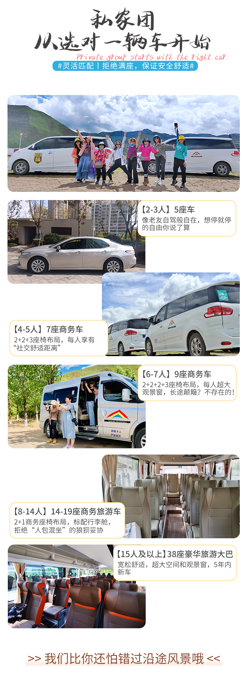 3、用车:2-3人安排5座车,4-5人安排7座商务车,6-7人安排9座商务车,8-14人安排14-19座旅游车,15人及以上安排38座旅游车;