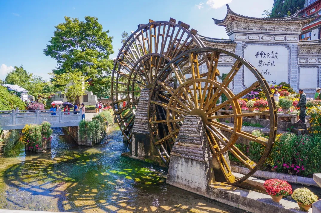 1、大水车:丽江古城必来的的标志性建筑打卡地,旁边挂了许多许愿牌,旁边有酒吧一条街,晚上热闹非凡