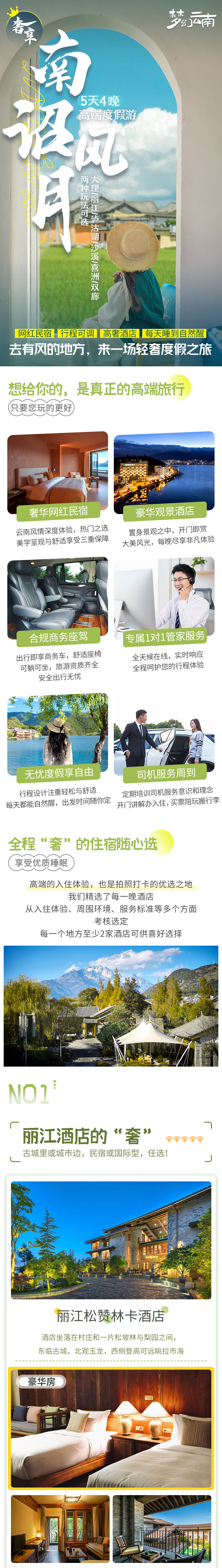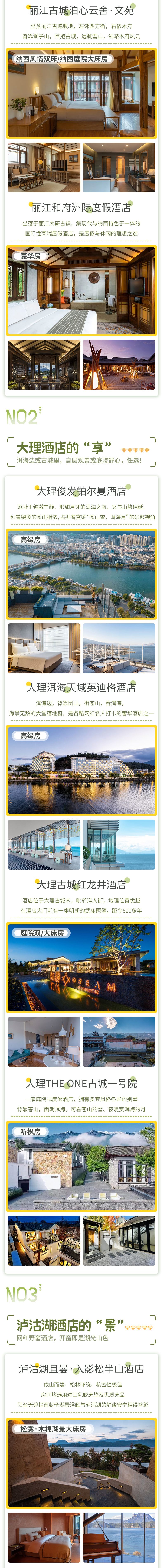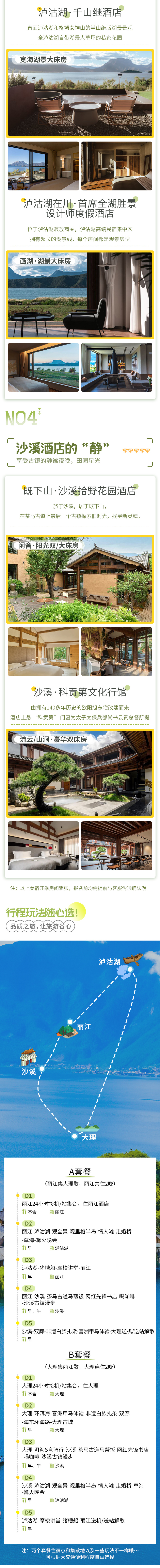 1、住宿:泸沽湖四钻酒店基础房型(参考:泸沽湖且曼·入影松半山酒店或泸沽湖·千山继酒店或泸沽湖在川·首席全湖胜景设计师度假酒店(摩梭女神全景店)或同级),沙溪五钻酒店/民宿基础房型(参考:既下山·沙溪拾野花园酒店或沙溪·科贡第文化行馆或同级),A套餐:丽江五钻酒店基础房型(参考:丽江古城泊心云舍·文苑或丽江松赞林卡酒店或丽江和府洲际度假酒店或同级),B套餐:大理五钻酒店基础房型(大理俊发铂尔曼酒店或大理洱海天域英迪格酒店或大理古城红龙井酒店或大理THE ONE古城一号院或同级);